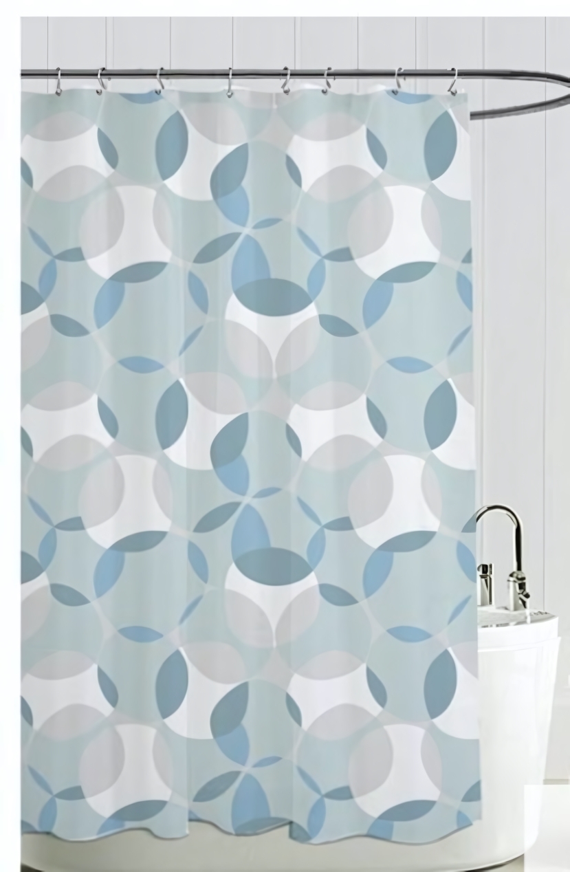 Штора «Селфи» сочетает практичность и эстетику — надёжно защищает от брызг во время душа, одновременно украшая пространство современным абстрактным дизайном. Светло-голубые переливы с геометрическими акцентами создают атмосферу морской свежести.