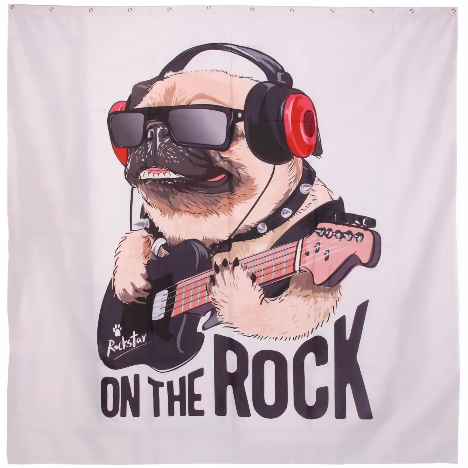 Водонепроницаемая штора с оригинальным рок-дизайном создаст настроение и надежно защитит пол от воды. Яркий принт с мультяшным мопсом-гитаристом добавит нотку юмора и индивидуальности в интерьер.