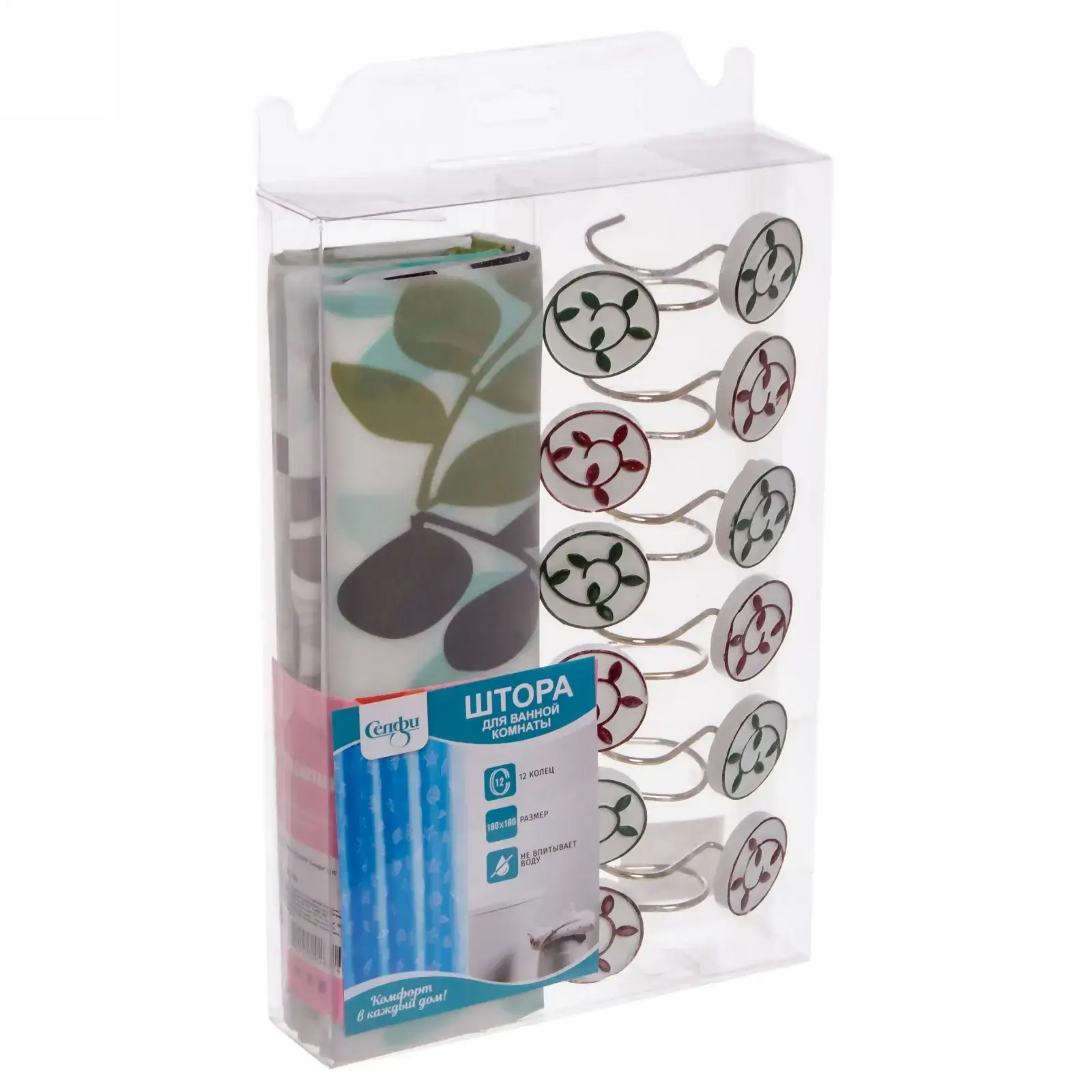 Штора выполнена из качественного ПВХ, что обеспечивает долговечность и простоту в уходе. Растительный принт в пастельных тонах создает атмосферу спокойствия и гармонии. Упаковка прозрачная, что позволяет увидеть содержимое и оценить качество материала перед покупкой.