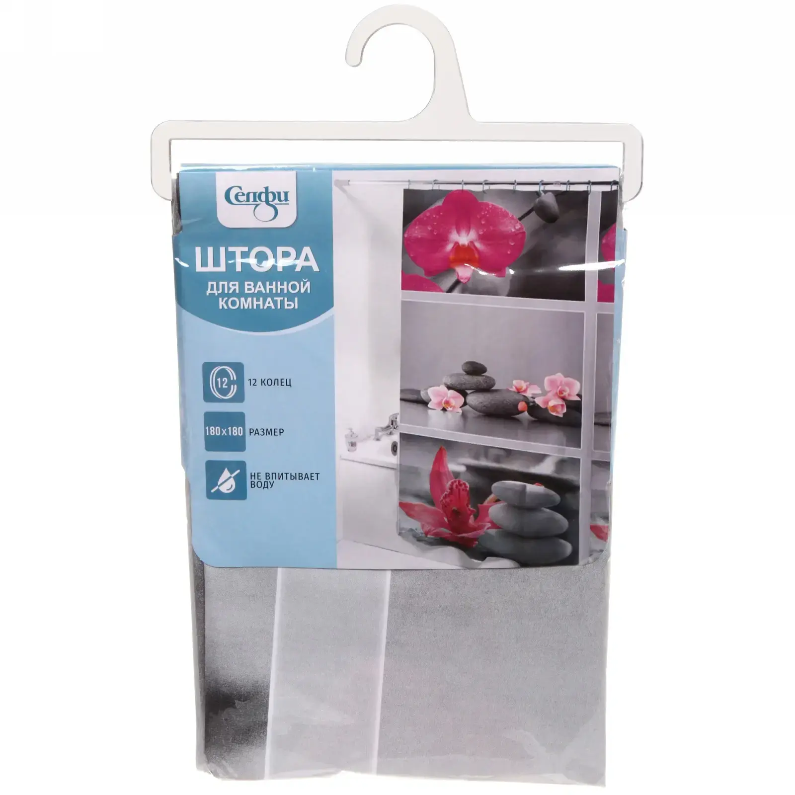 Штора имеет размеры 180x180 см, что делает её идеальной для большинства стандартных душевых кабин. Изготовленная из водоотталкивающего ПВХ, она легко очищается и не впитывает влагу, что обеспечивает долговечность и простоту в уходе. Установка шторы не требует специальных навыков — просто повесьте её на карниз с помощью 12 пластиковых колец, которые идут в комплекте.