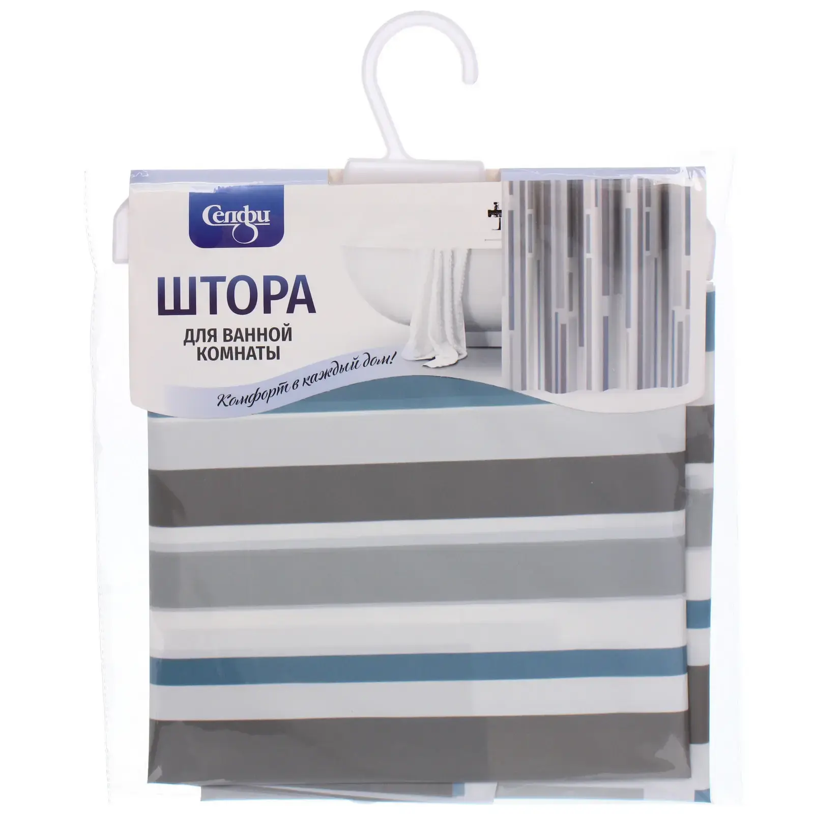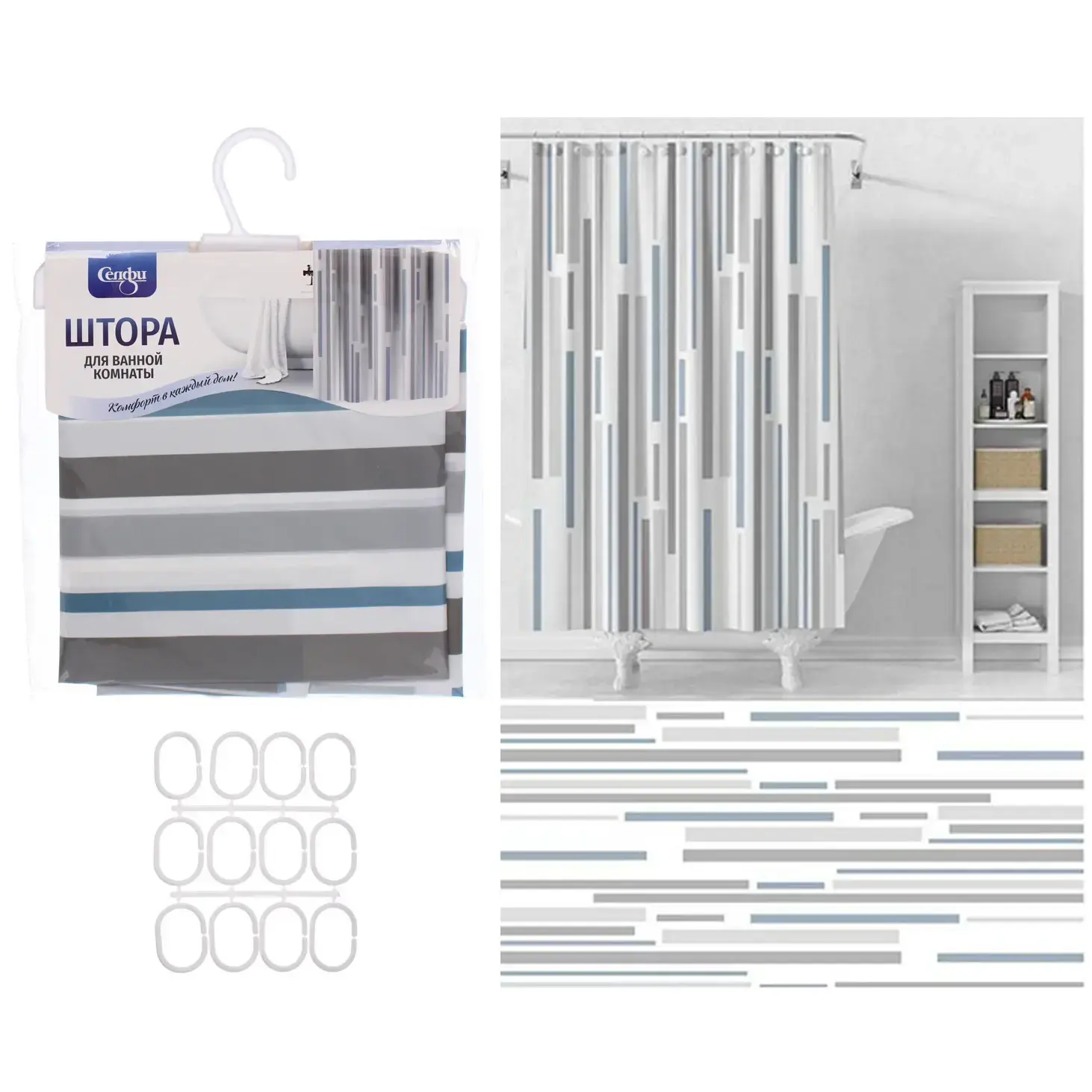 Штора легко устанавливается благодаря 10 пластиковым кольцам, которые входят в комплект. Она подходит для большинства стандартных душевых кабин и ванн, обеспечивая надежную защиту от воды. Материал PEVA гарантирует долговечность и простоту в уходе, а также отсутствие неприятного запаха хлора.