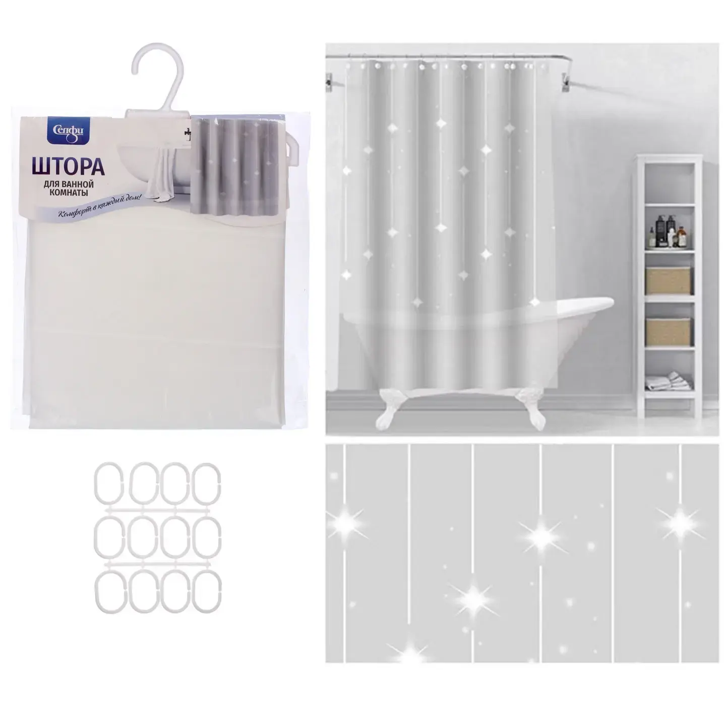 Штора легко устанавливается с помощью пластиковых колец, которые входят в комплект. Она подходит для большинства стандартных душевых кабин и ванн, обеспечивая надежную защиту от брызг. Благодаря своему размеру, штора идеально подходит для использования в любых ванных комнатах, независимо от их стиля и дизайна.