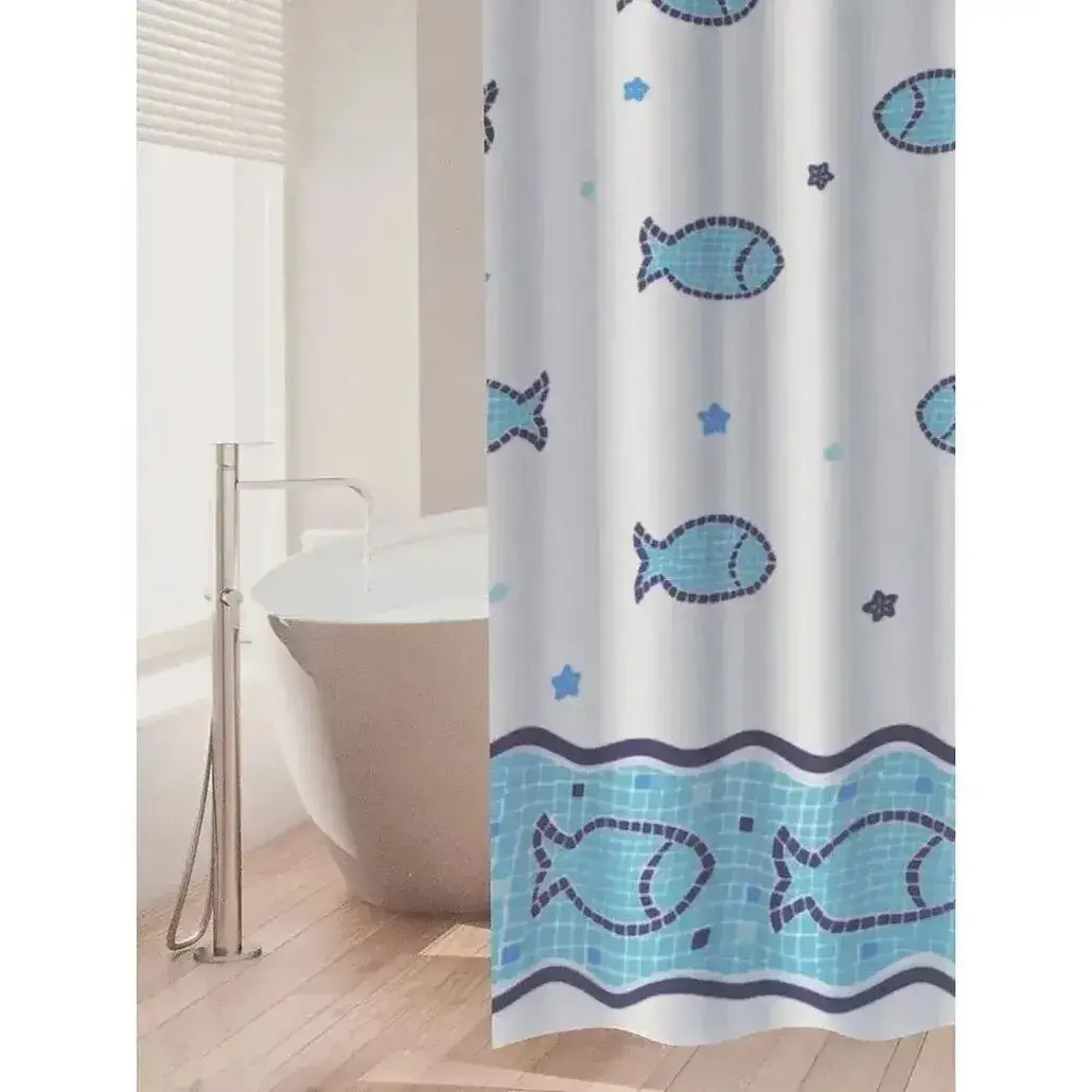 Создайте уютную атмосферу с дизайнерской шторой, украшенной мозаикой из рыбок и звездочек. Яркий акцент для современного интерьера с практичной защитой от брызг.