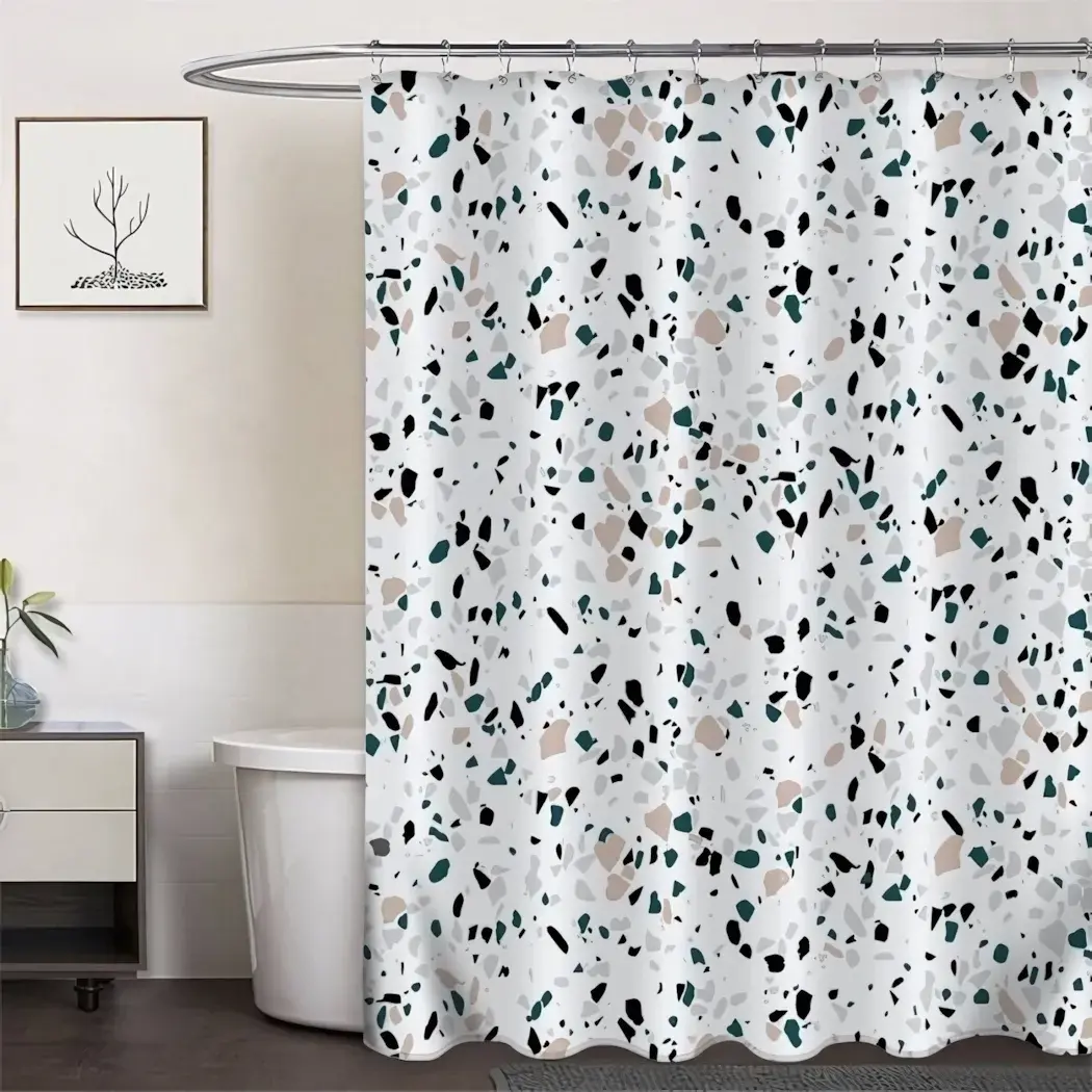 Цветовая гамма шторы включает нейтральные тона – белый, черный, серый, бежевый и голубой – что делает ее универсальным решением для любого стиля ванной комнаты.