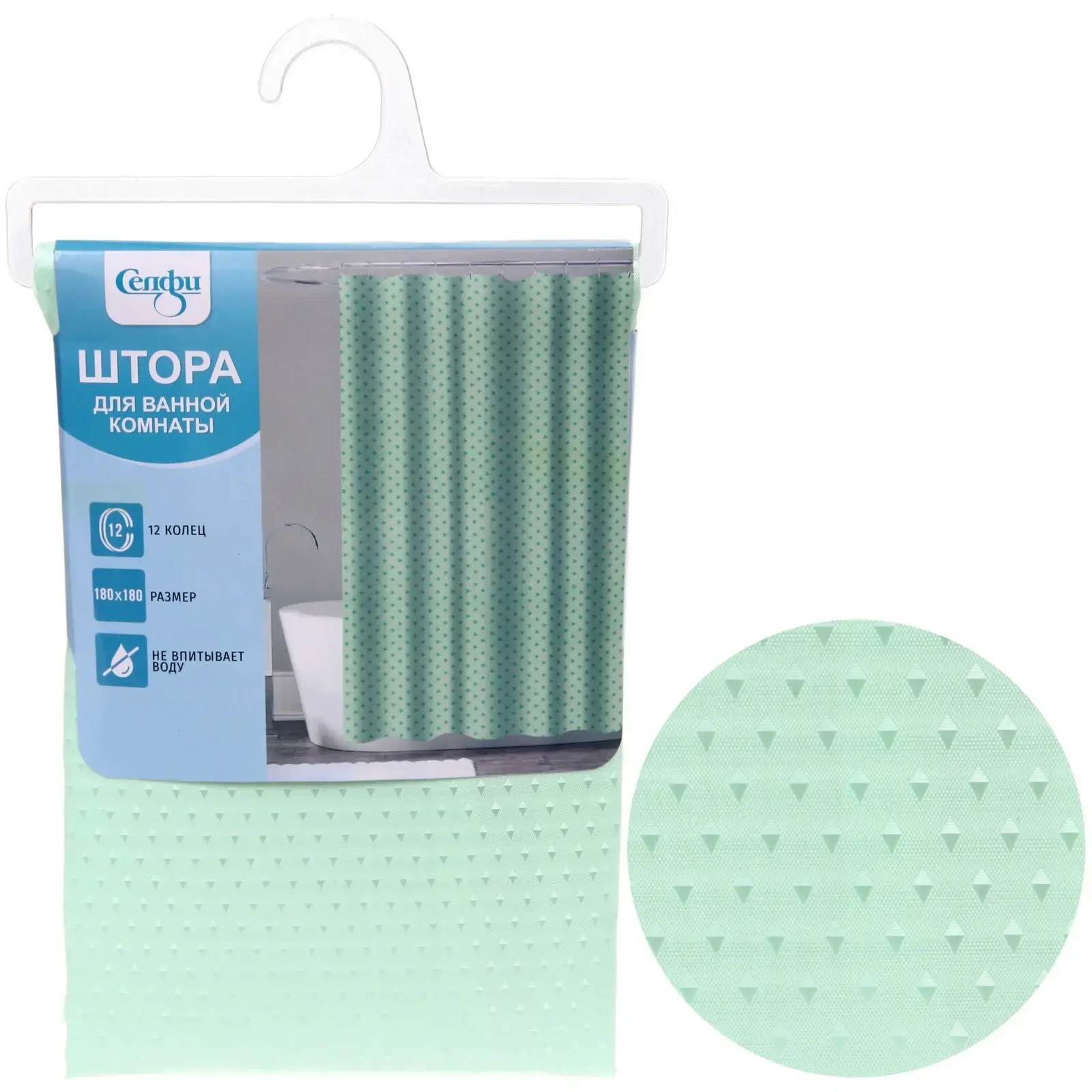 Размер шторы составляет 180х180 см, что делает ее универсальной для большинства ванных комнат. Материал полиэстер обеспечивает надежность и долговечность, а легкий зеленоватый цвет с текстурой в виде треугольников добавляет стильный акцент. Упаковка с прозрачной оболочкой и петлей для подвешивания делает ее удобной для хранения и транспортировки.
