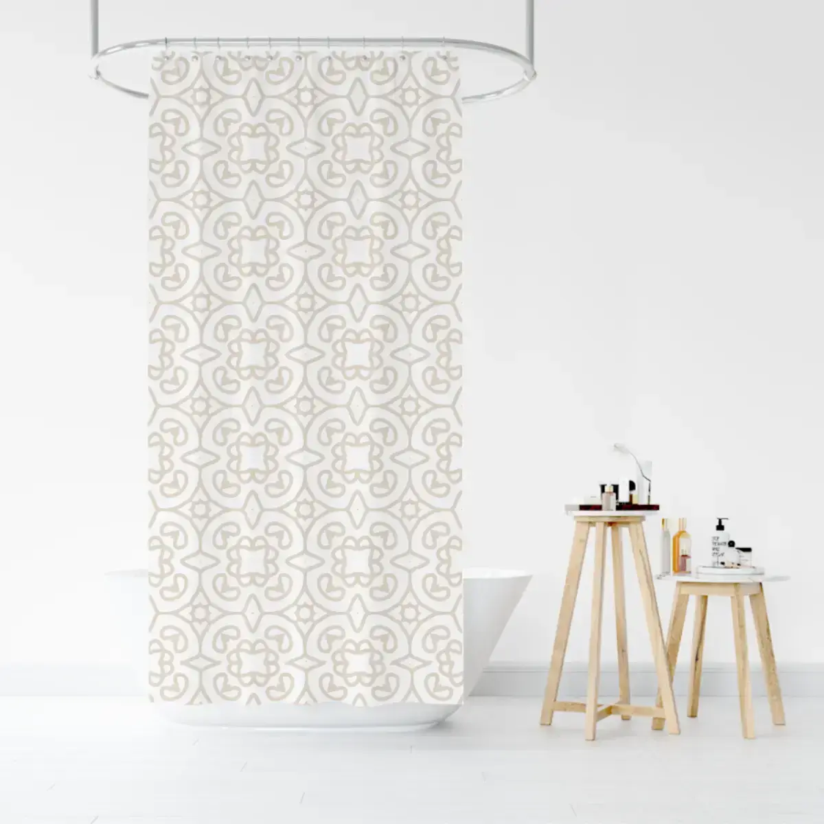 Размеры шторы составляют 200х200 см, что позволяет ей идеально подходить для большинства ванных. Материал полиэстер обладает водоотталкивающими свойствами, что делает его идеальным для использования в ванной комнате. Стильный узор в светлых тонах с геометрическими элементами добавляет изысканности и современности вашему интерьеру.