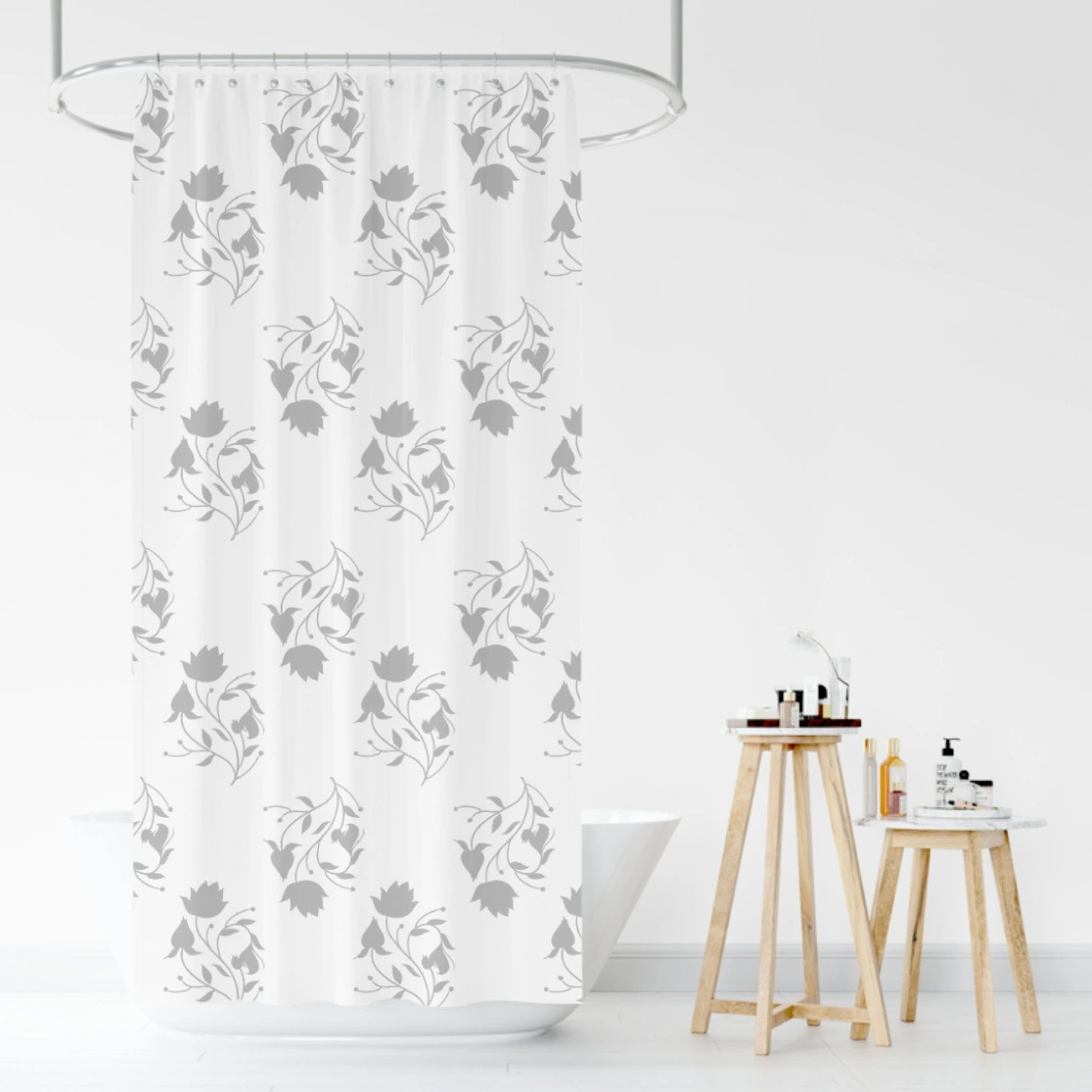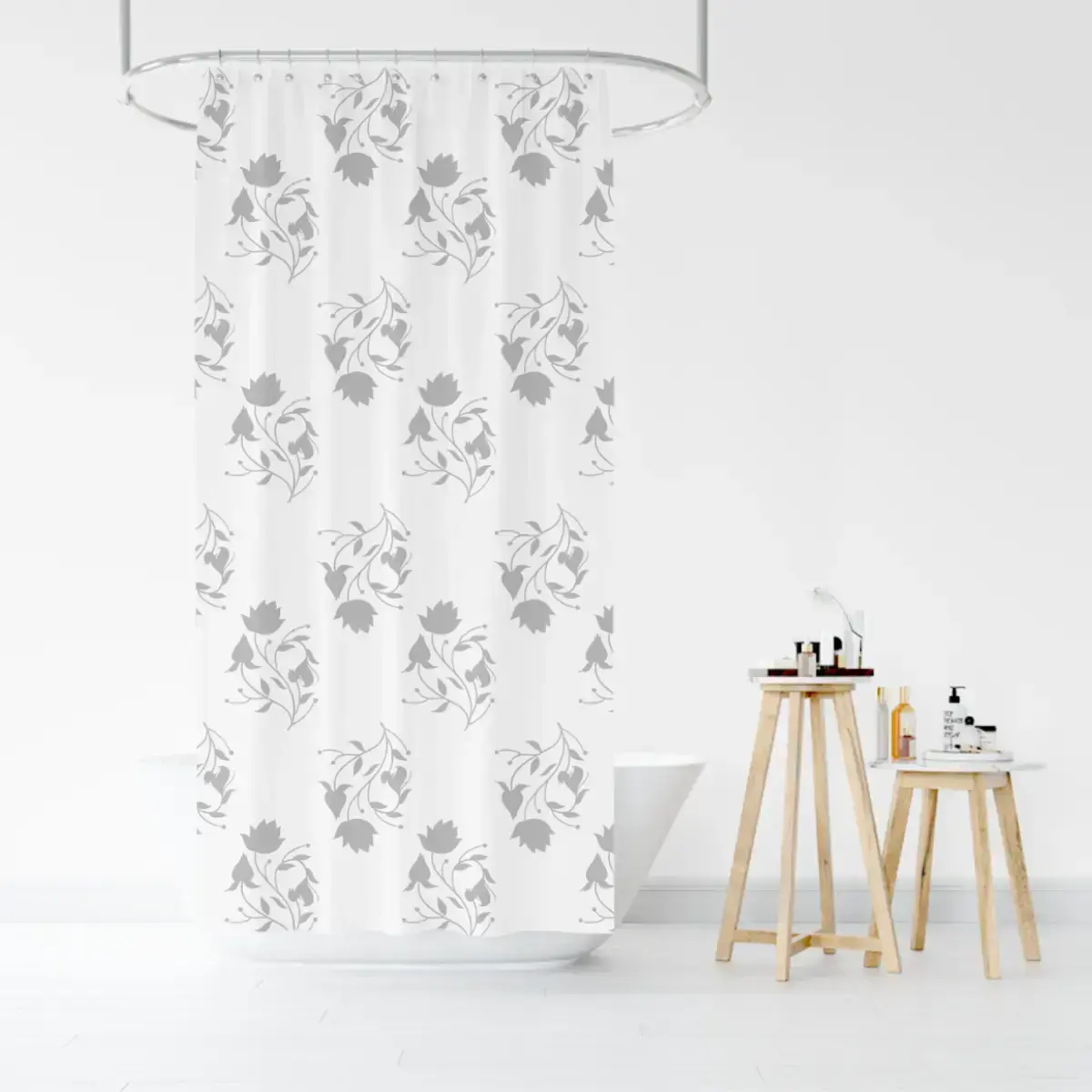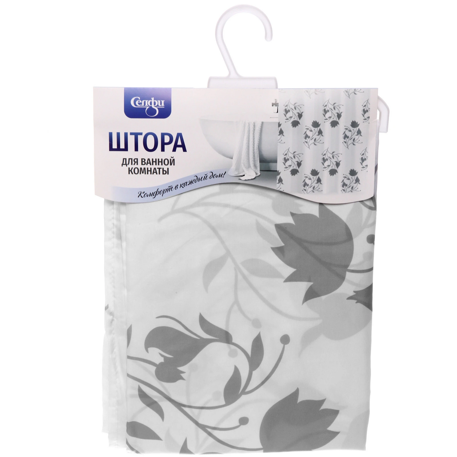 Размер шторы составляет 200 см на 200 см, что делает её универсальной для большинства стандартных ванных. Цветочный узор в серых тонах на белом фоне добавляет изысканности и гармонии в интерьер. Не упустите возможность сделать вашу ванную комнату более комфортной и стильной с этой практичной шторой!