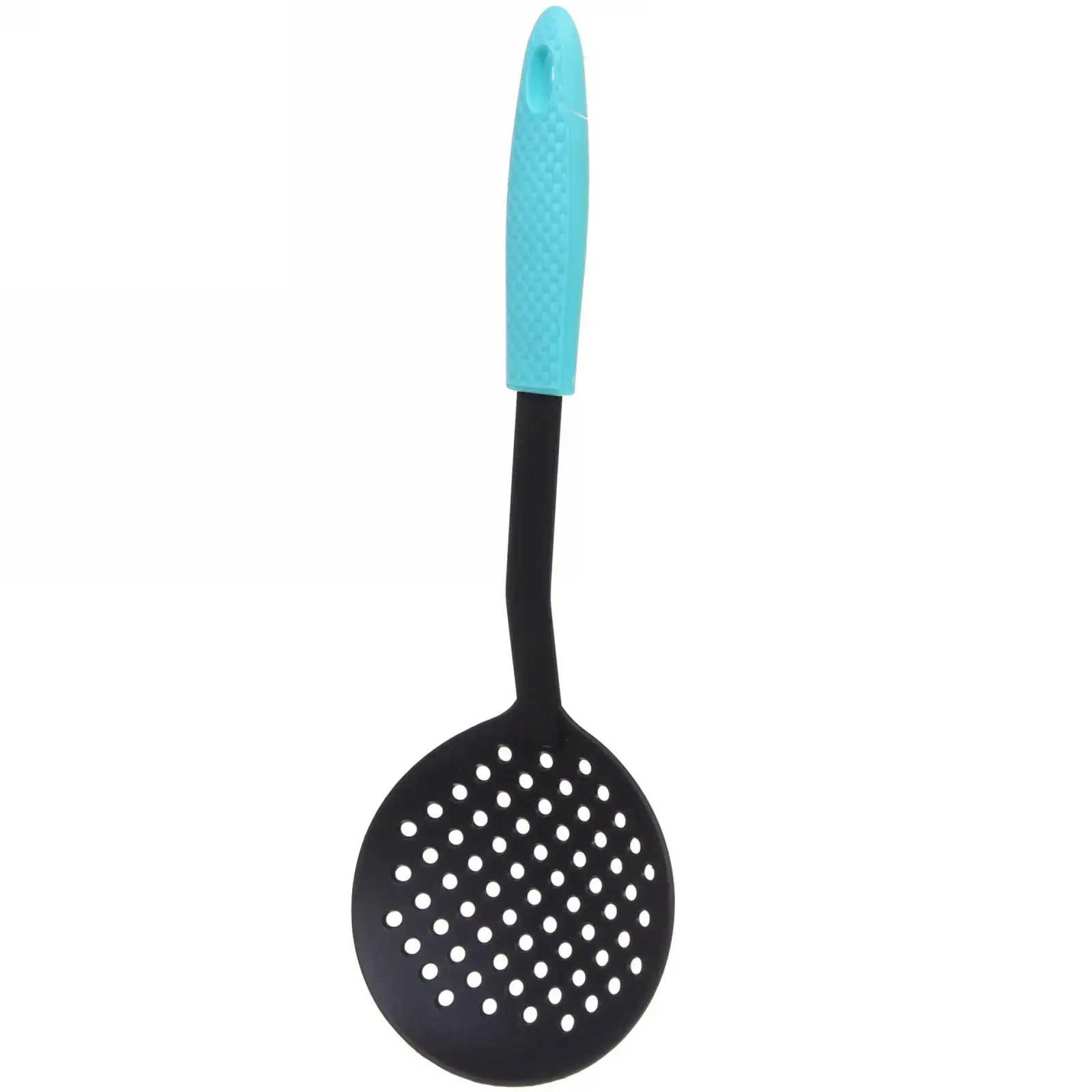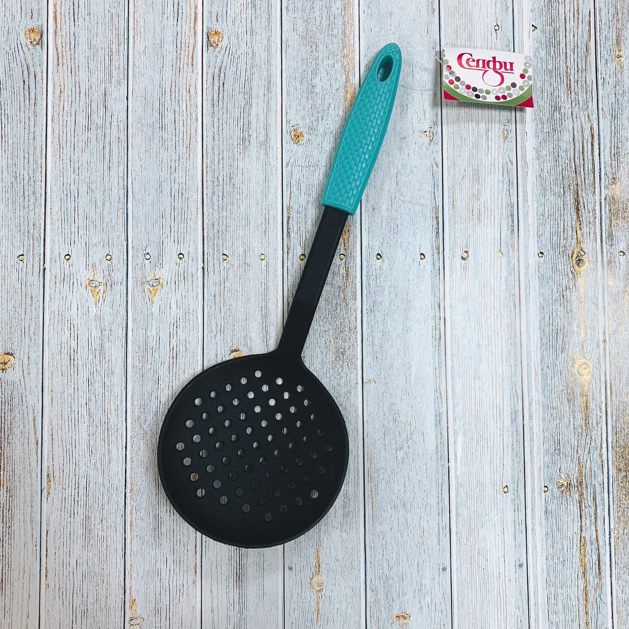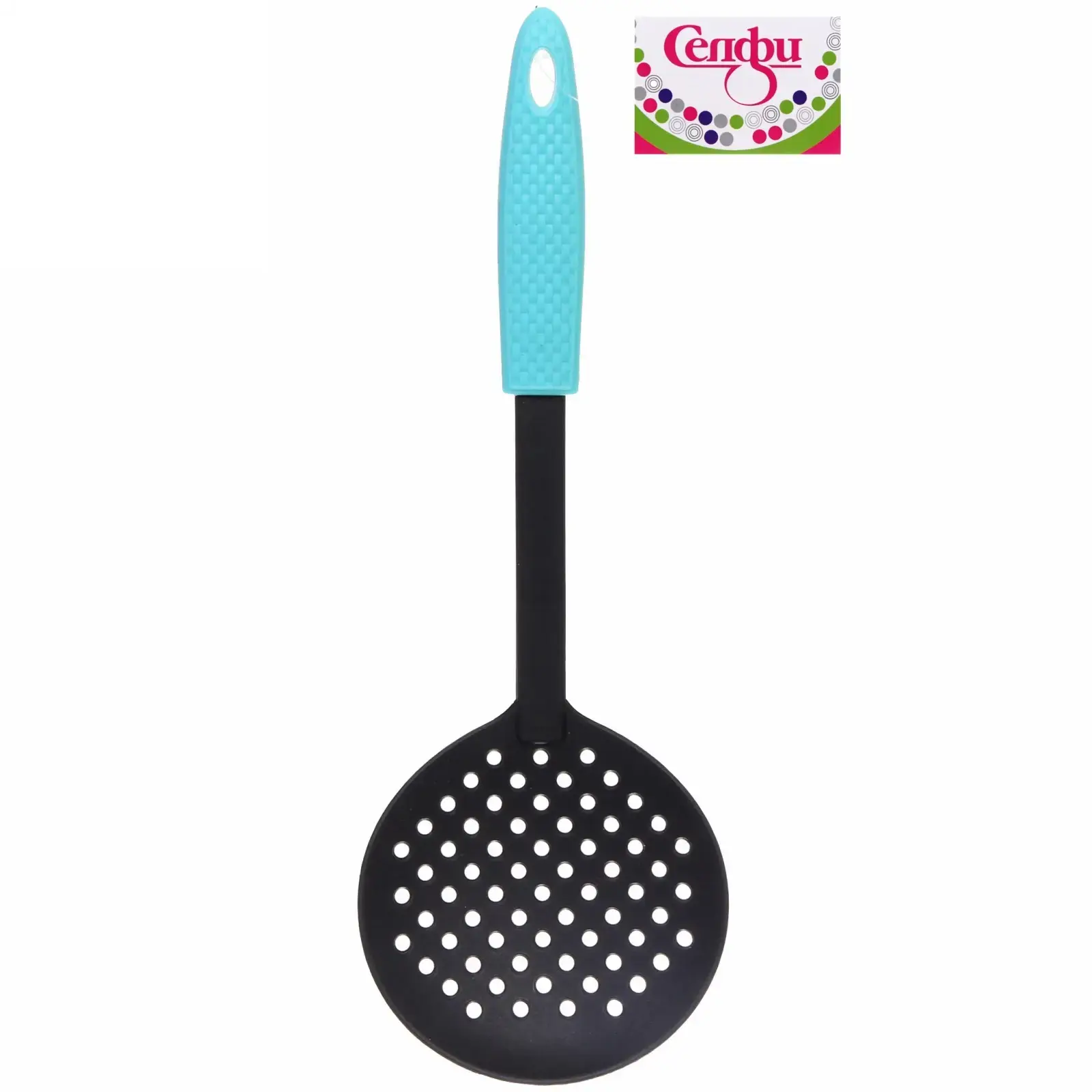 Шумовка имеет черную рабочую поверхность с множеством отверстий, что позволяет эффективно сливать жидкость. Ручка выполнена в голубом цвете и имеет текстурированную поверхность для удобного захвата. Размеры шумовки не указаны, но её форма и конструкция делают её подходящей для большинства кухонных задач. Не упустите возможность сделать вашу готовку более комфортной и приятной с шумовкой «Гурман»!