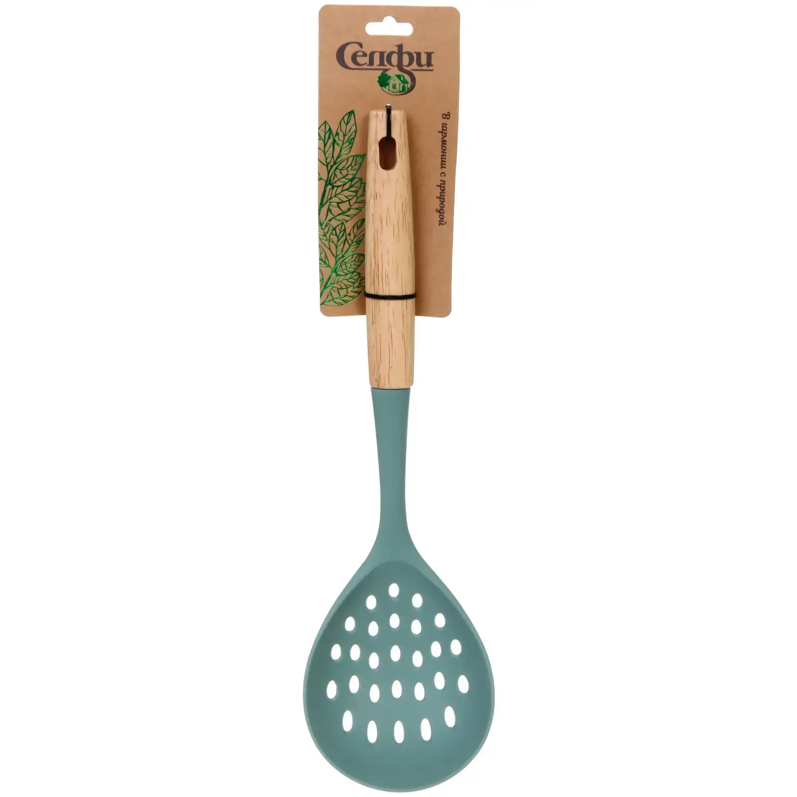 Шумовка имеет стильный дизайн с светло-зеленой лопаткой и деревянной ручкой, что делает её не только функциональной, но и красивой. Размеры и форма позволяют удобно использовать её в любых кулинарных задачах. Не упустите возможность сделать вашу кухню более удобной и стильной с шумовкой «OLIVA»!