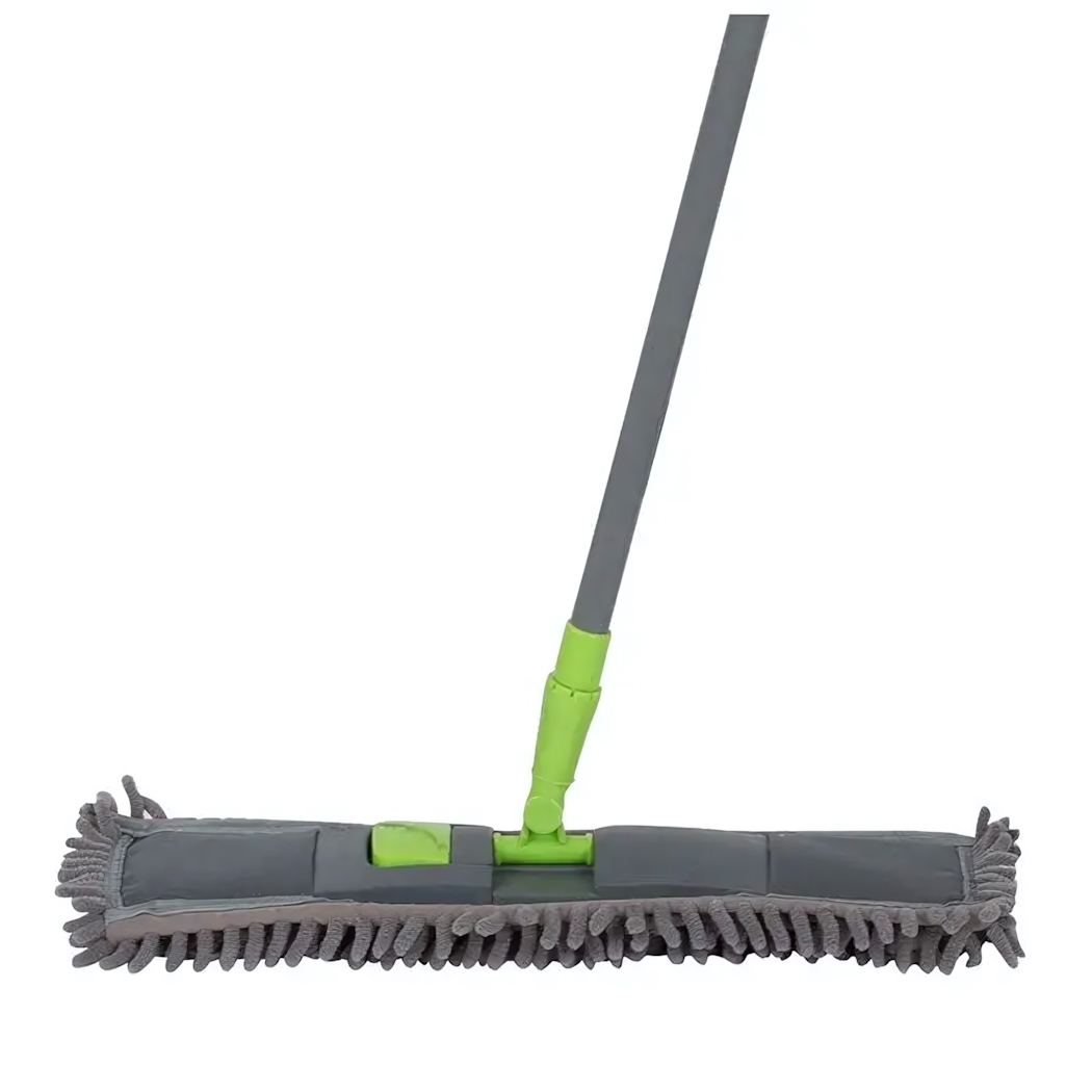 Металлическая телескопическая ручка с зеленым акцентом обеспечивает комфортную работу, а специальная система крепления гарантирует надежную фиксацию насадки во время уборки.
