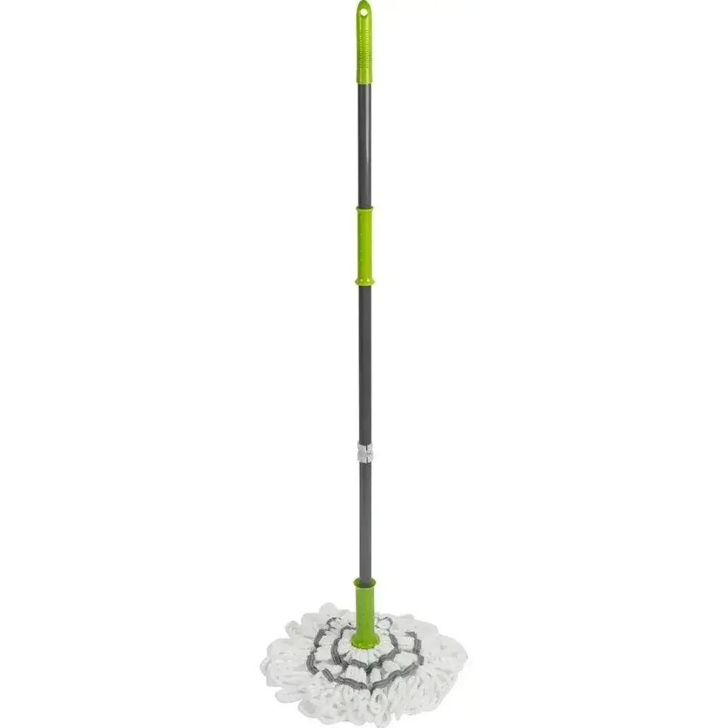Эргономичная рукоять с противоскользящим покрытием обеспечивает надежный хват. Поворотный механизм на 180° позволяет мыть пол под мебелью без наклонов. Совместима со стандартными насадками из микрофибры и тряпичными чехлами.