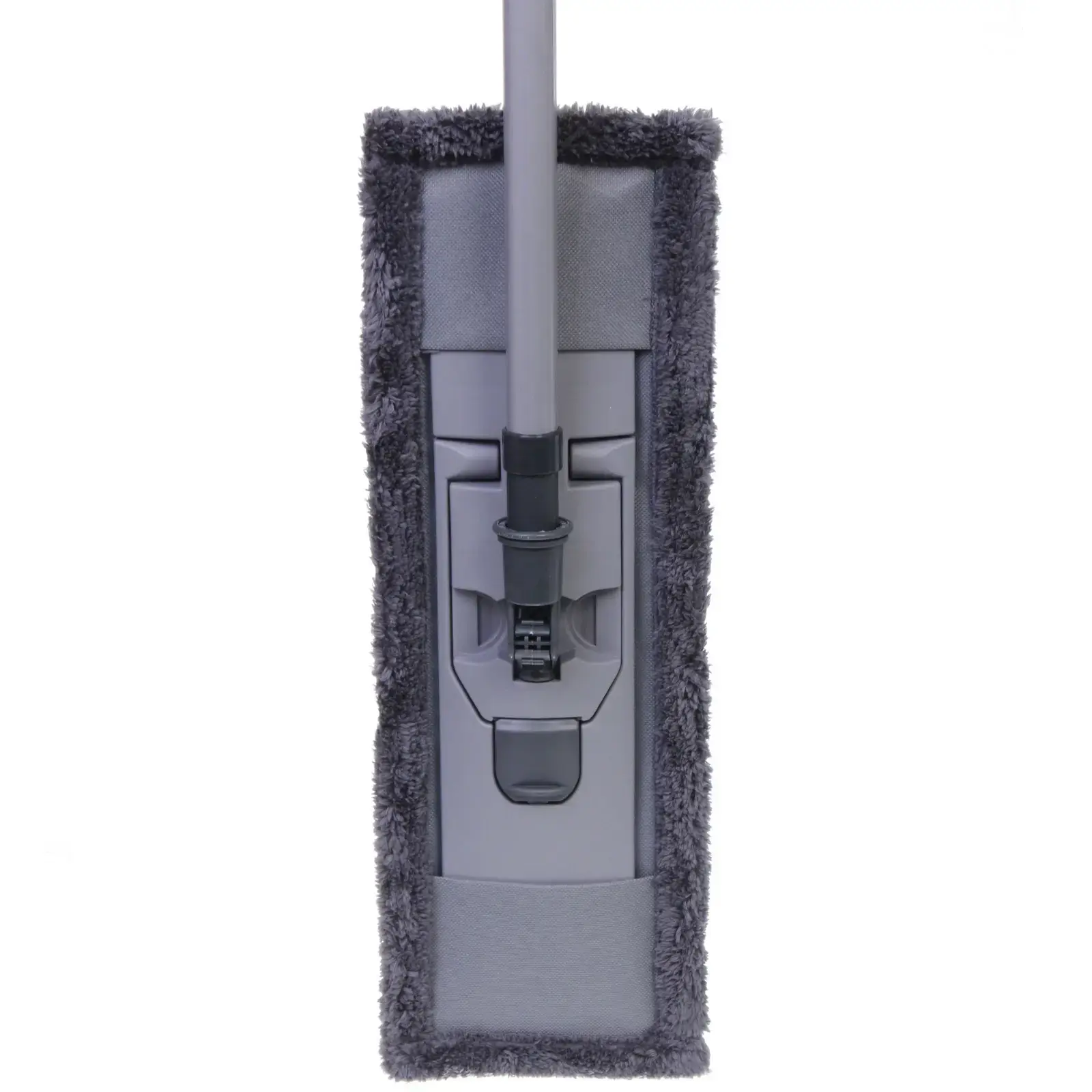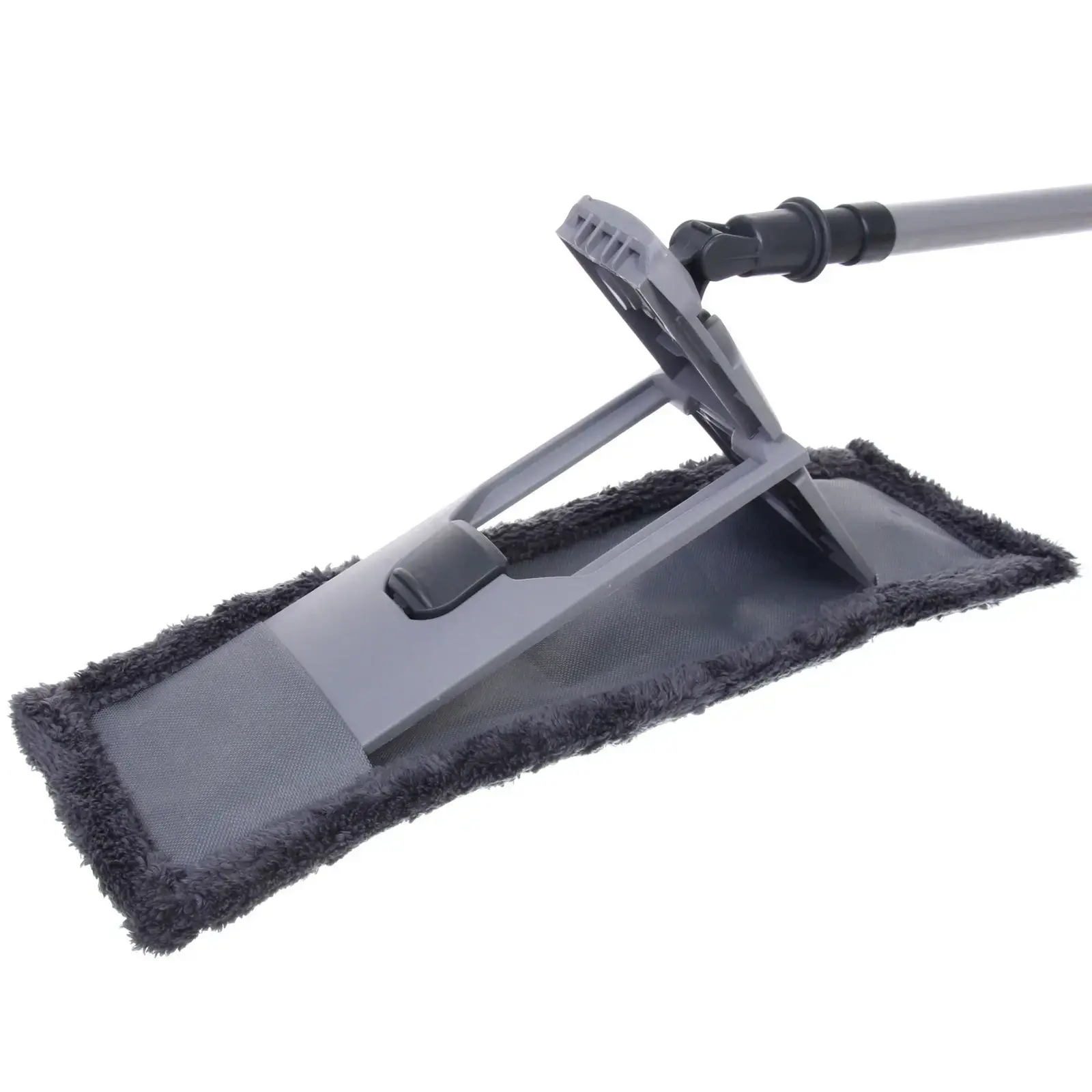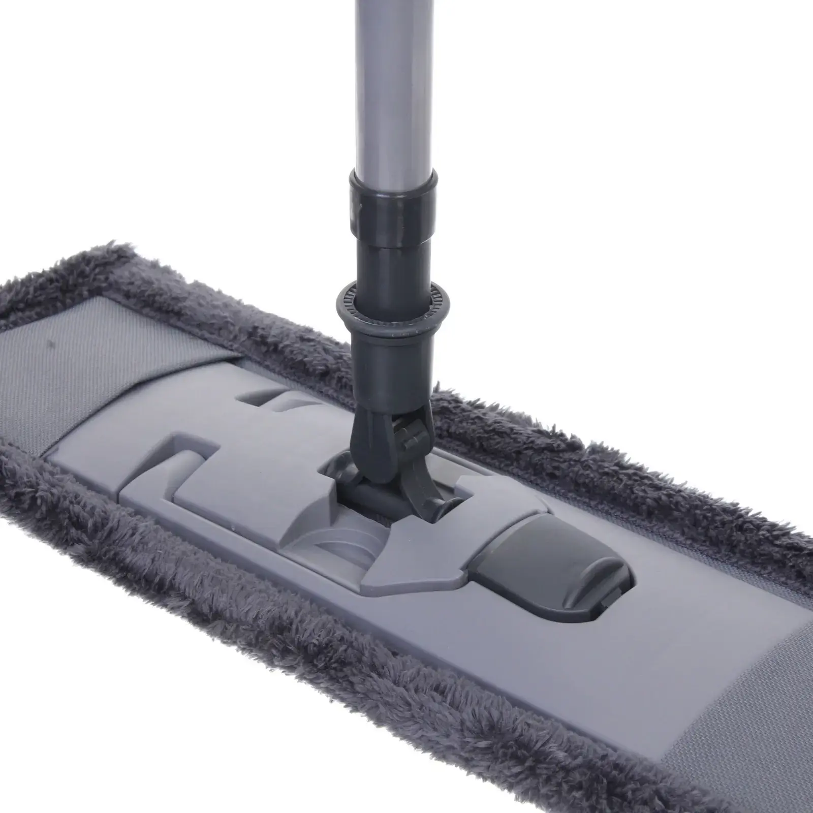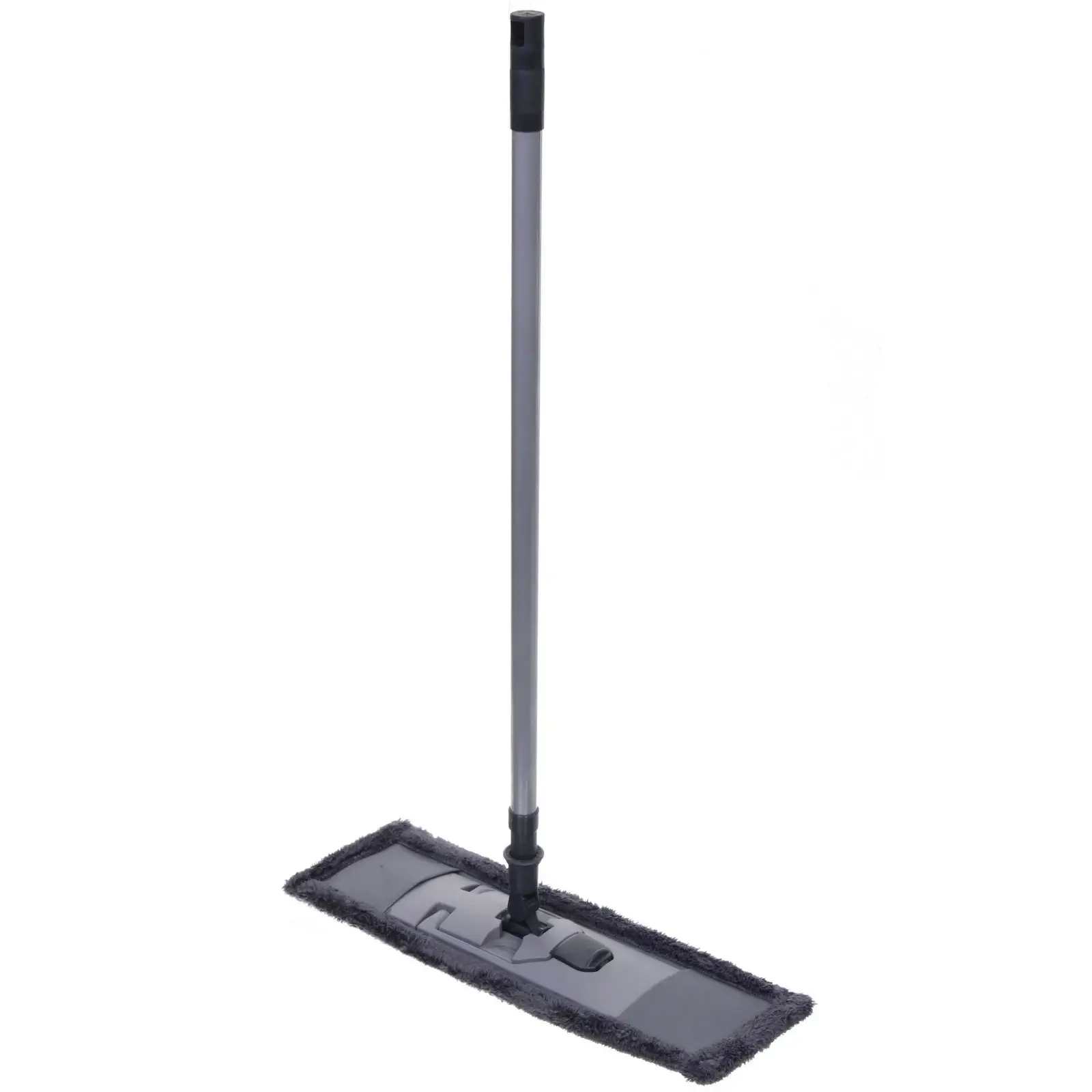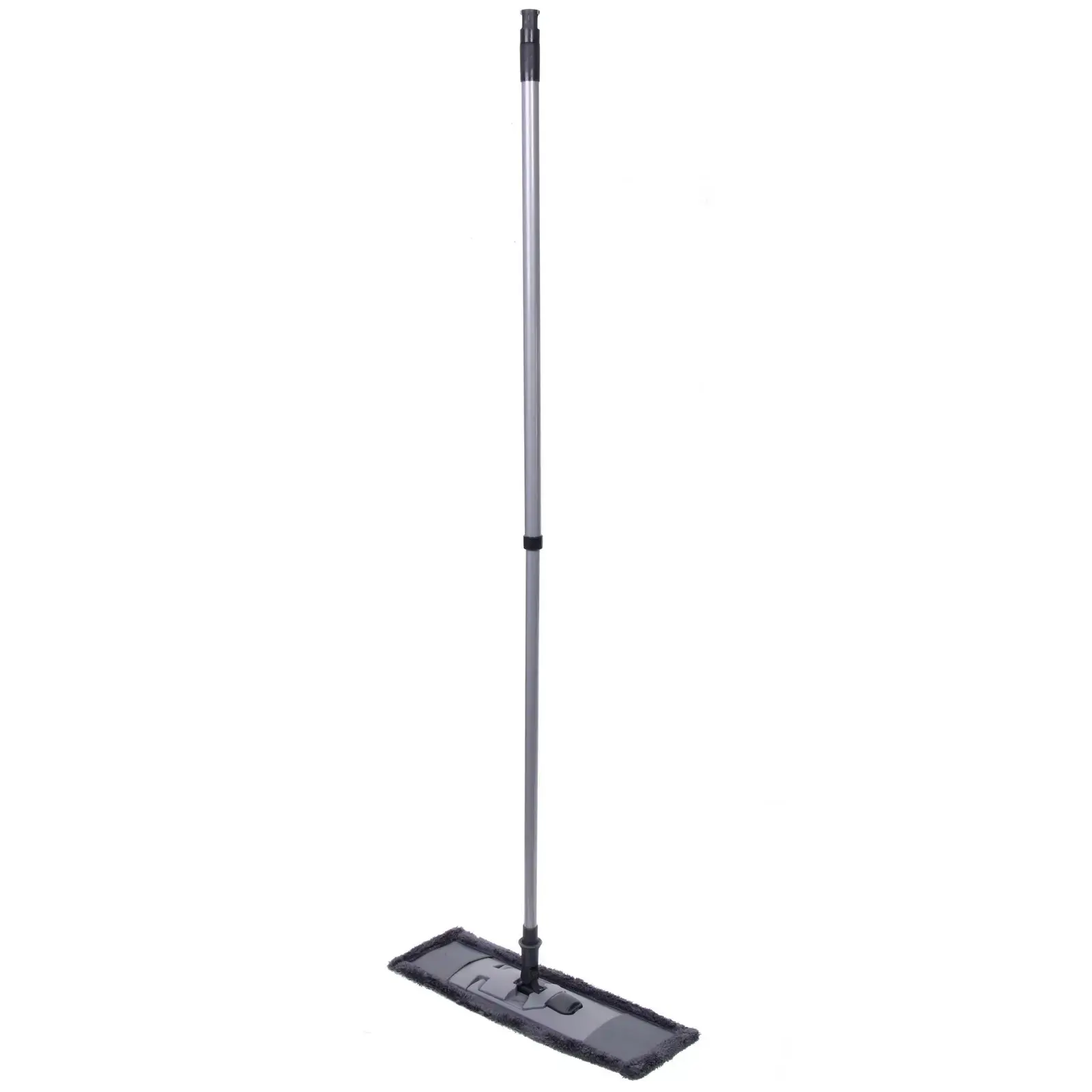 Швабра имеет прямоугольную рабочую поверхность, что позволяет эффективно убирать даже в труднодоступных местах. Размер насадки составляет 30 см в ширину, а длина ручки регулируется, что делает её подходящей для людей разного роста. Материалы, из которых изготовлена швабра, включают металл, микрофибру и пластик, что обеспечивает долговечность и надежность в эксплуатации.