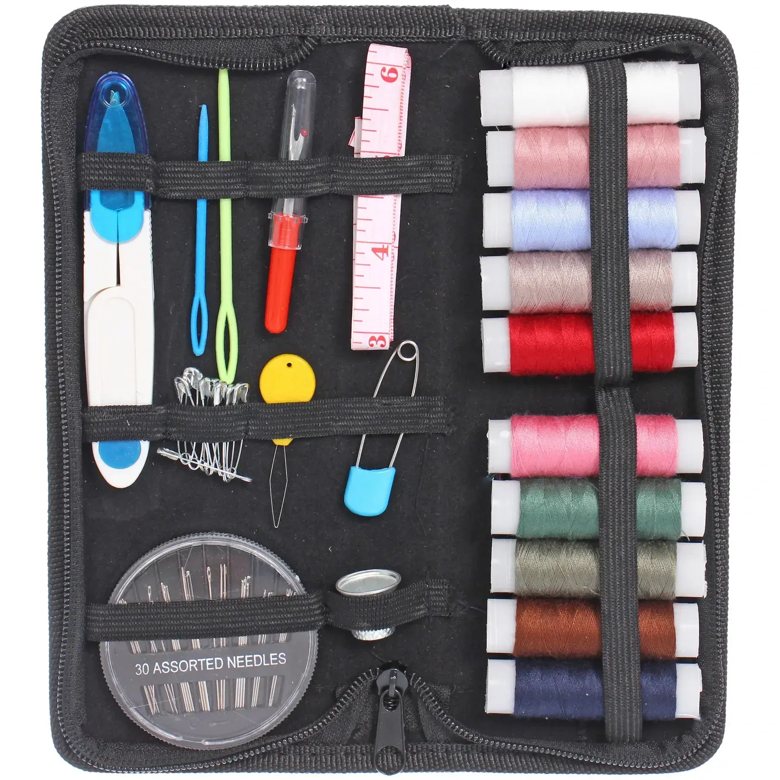 Швейный набор идеально подходит как для начинающих, так и для опытных мастеров. Он включает в себя все необходимые инструменты: десять катушек ниток различных цветов, набор игл, линейку, булавки и вспарыватель. Все принадлежности аккуратно размещены в черном органайзере с молнией, что обеспечивает удобство хранения и транспортировки.