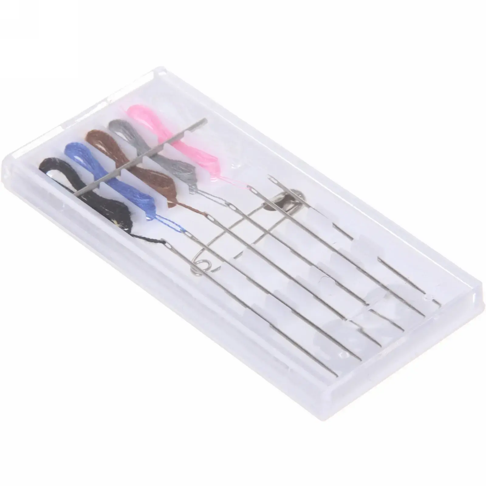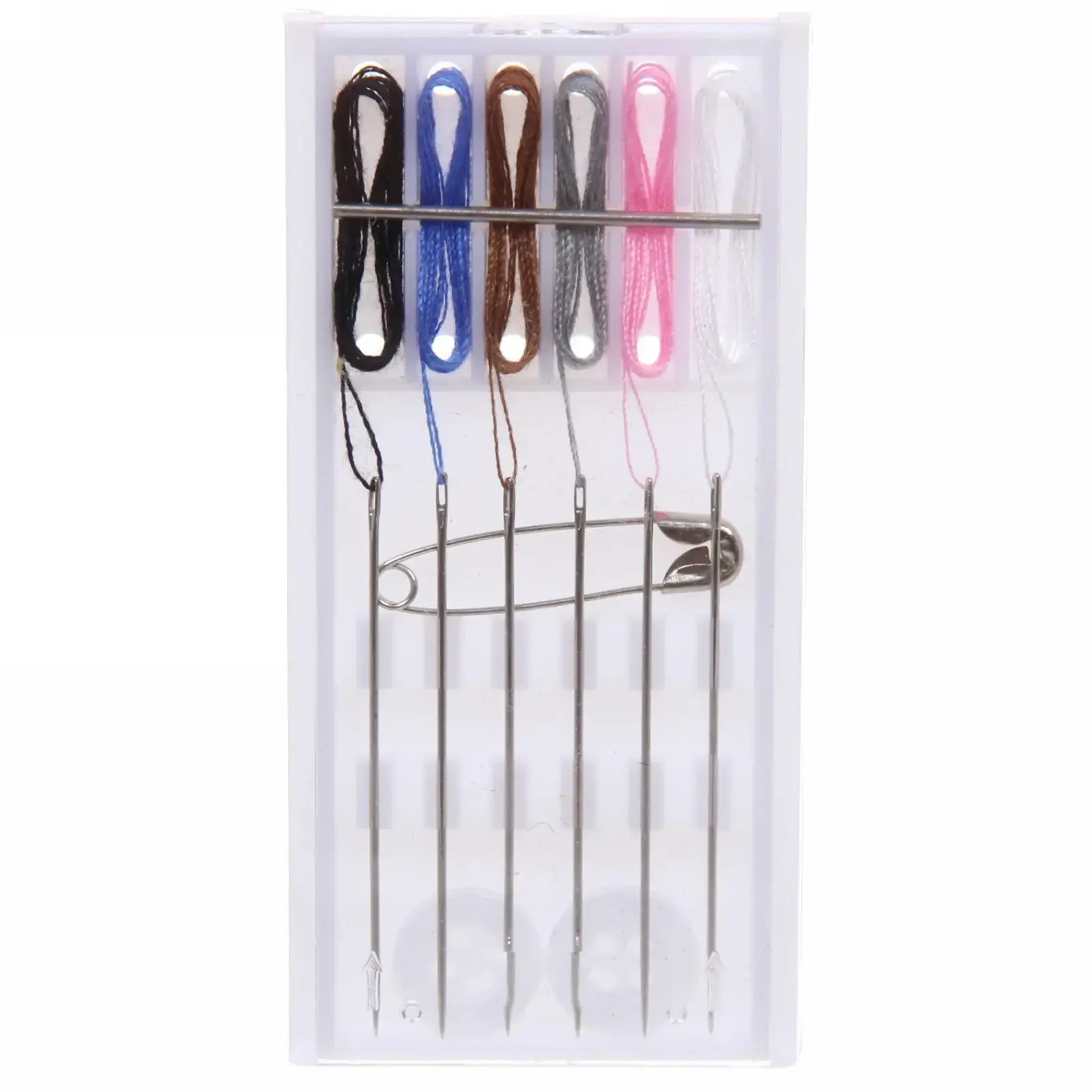 Размеры упаковки и отдельных элементов не указаны, но они стандартные для швейных наборов. Набор включает в себя иглы с гладкой поверхностью и острыми концами, что обеспечивает легкость в использовании. Нитки представлены в шести цветах: черный, коричневый, синий, серый, розовый и белый, что позволяет вам выбрать подходящий цвет для любого проекта.