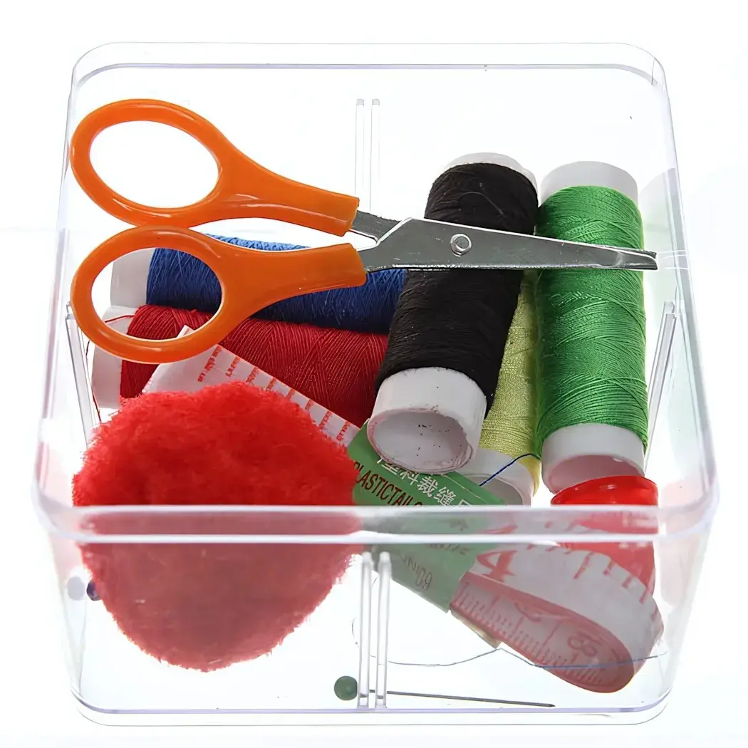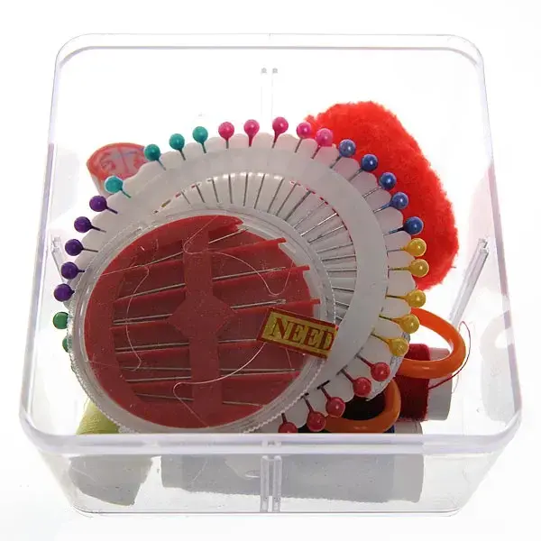 В набор входят ножницы, нитки различных цветов, иголки, приспособление для вдевания нитки, булавки и другие полезные принадлежности. Все предметы аккуратно упакованы в компактный контейнер, который удобно брать с собой в дорогу или хранить дома. Набор идеально подходит для использования в командировках, так как занимает мало места и позволяет быстро решить любые швейные задачи.