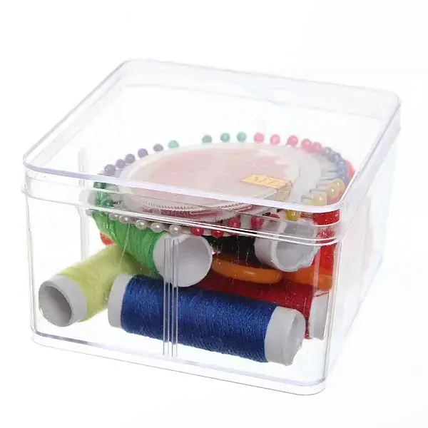 Контейнер имеет квадратную форму и выполнен из прочного пластика, что обеспечивает долговечность и надежность. Внутри вы найдете катушки с нитками разных цветов, булавки с разноцветными головками и другие необходимые аксессуары. Размеры контейнера компактны, что позволяет удобно хранить его в любом месте.