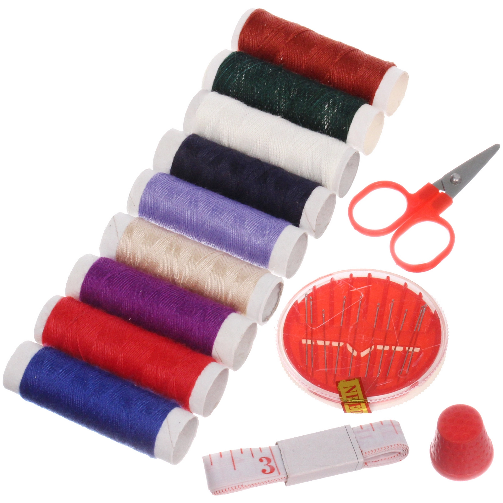 - Полная комплектация: в набор входят острые ножницы с эргономичными ручками, иглы разной длины, наперсток и сантиметровая лента.