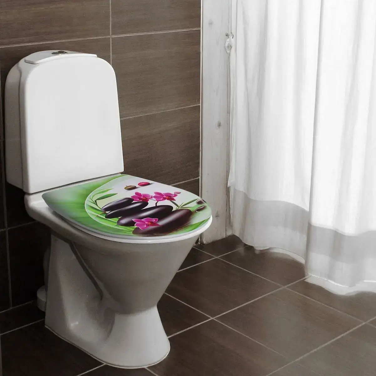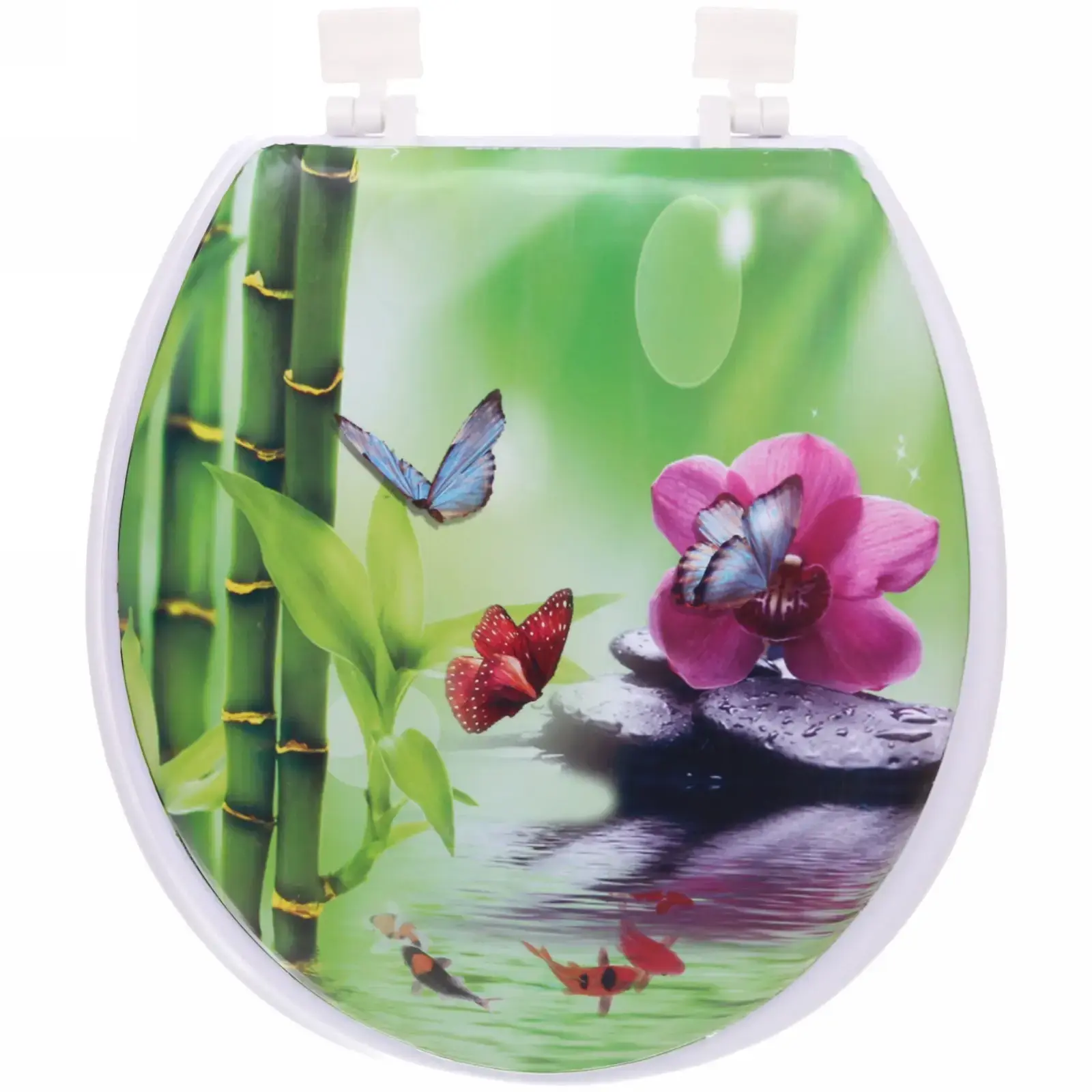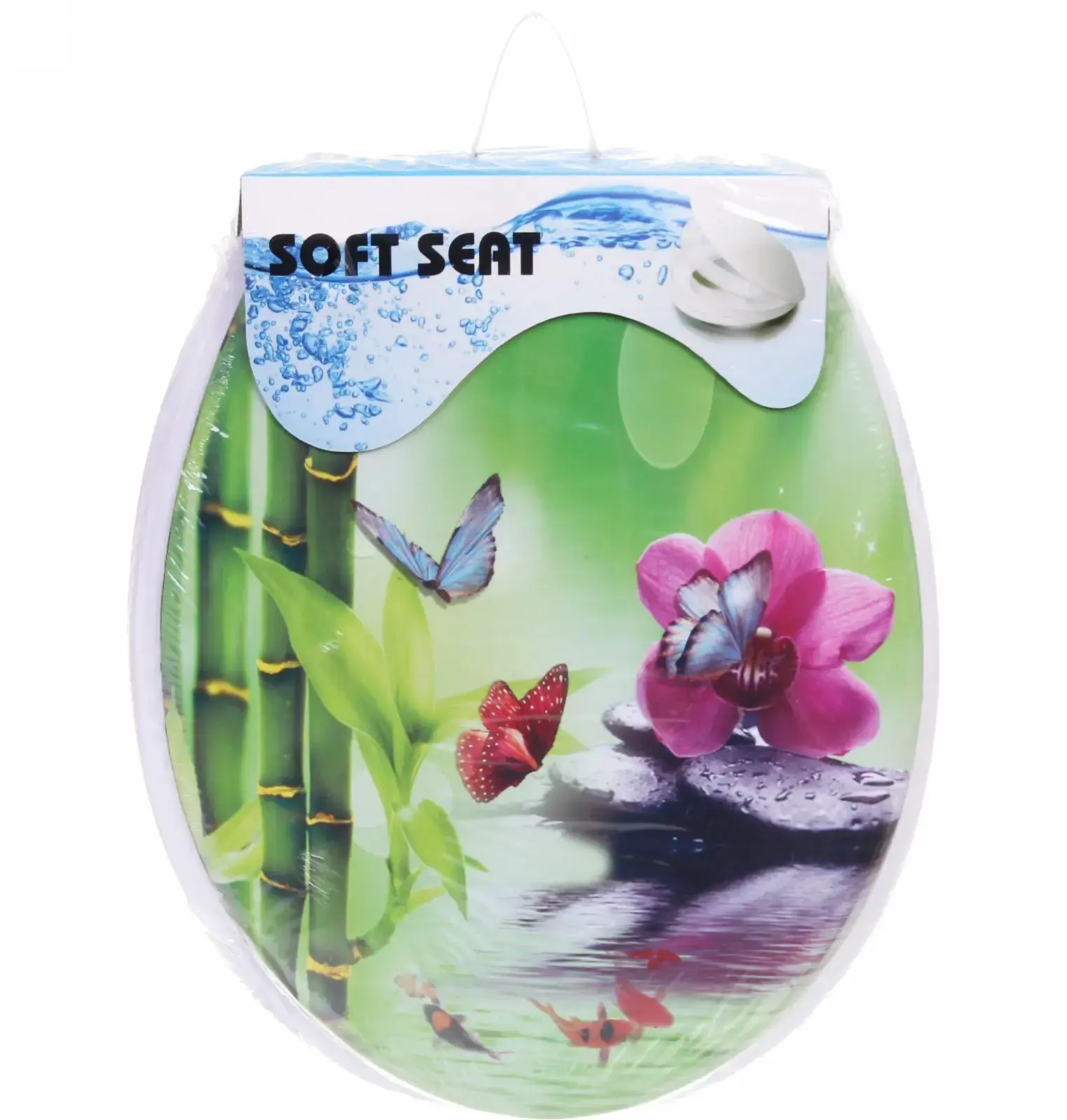 Пластиковое сиденье для унитаза с декоративным принтом «Орхидея» сочетает комфорт использования и эстетику природного дизайна. Яркие изображения цветов, бабочек и водных элементов создают атмосферу свежести, превращая обычный санузел в уютное пространство.