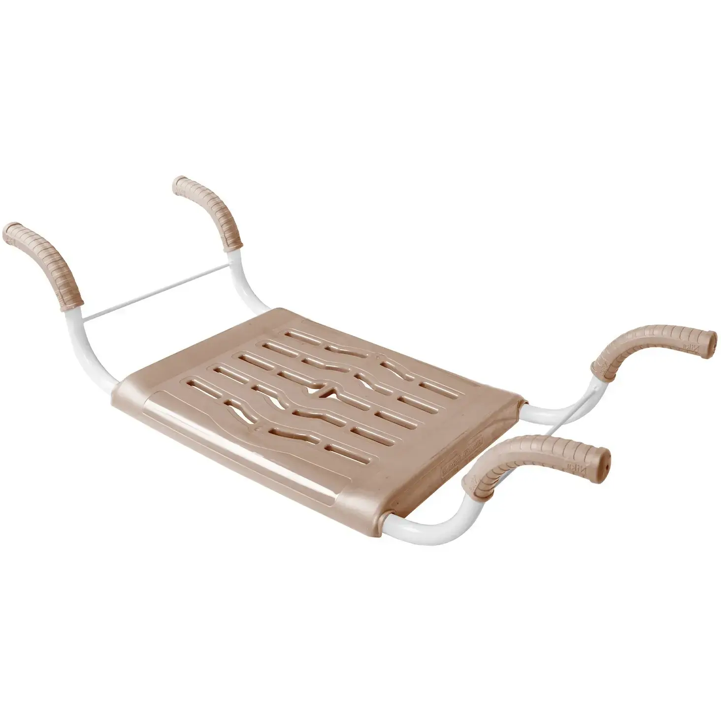 Сиденье выполнено в бежевом цвете с белыми металлическими элементами, что делает его стильным дополнением к интерьеру ванной комнаты. Рифленая поверхность предотвращает скольжение, а резиновые накладки на ручках обеспечивают комфортный захват. Размеры сиденья стандартные, что позволяет легко интегрировать его в любую ванну.