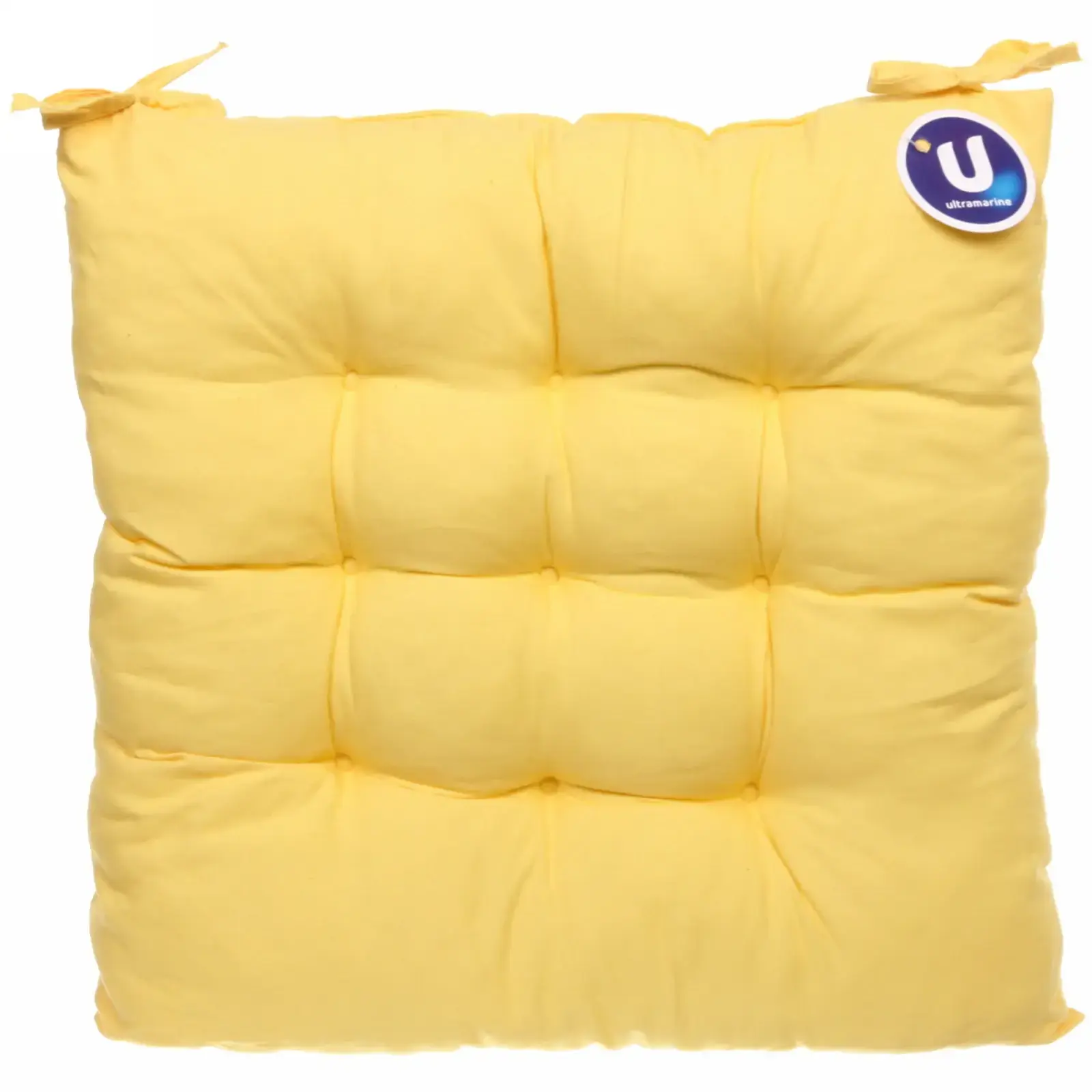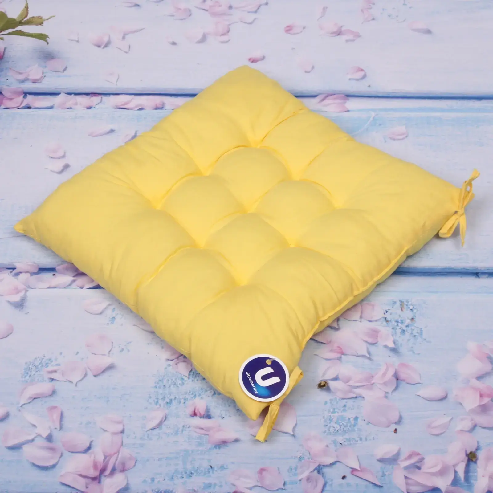 Квадратная форма 40×40 см оптимальна для большинства стульев. Плотная стежка предотвращает смещение наполнителя, а двойная строчка по периметру гарантирует долговечность. Универсальный желтый оттенок гармонично сочетается с деревянной, пластиковой и кованой мебелью.
