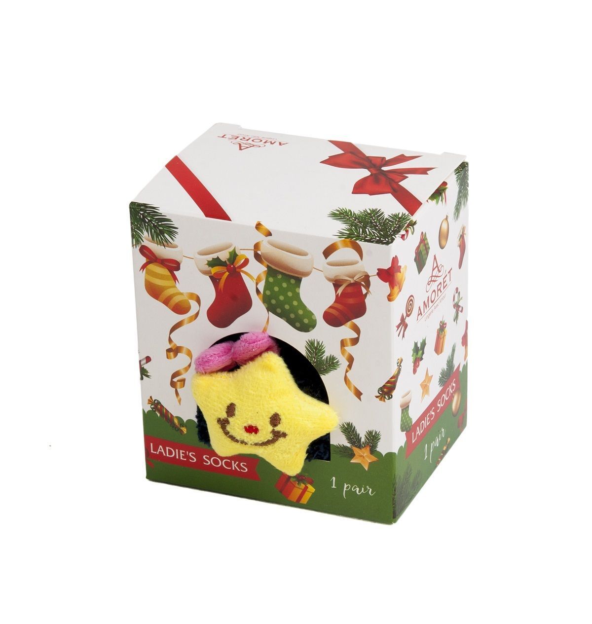 Почему стоит выбрать именно эти носки? Во-первых, их мягкость и уютный материал делают их идеальными для холодных дней. Во-вторых, забавная игрушка в виде жёлтой звёздочки с лицом и розового бантика добавляет игривости и оригинальности. Упаковка в яркой праздничной коробочке делает их отличным вариантом для подарка на любой праздник.