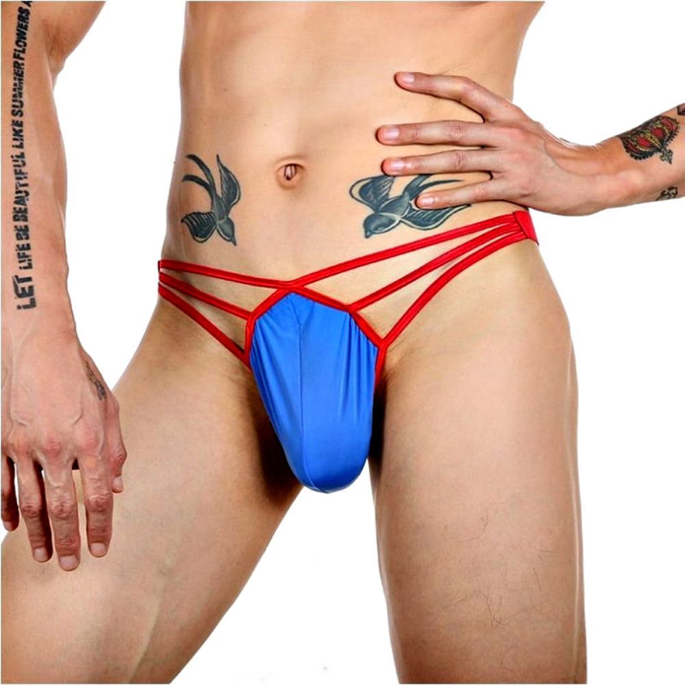 Размер: M. Цвет: синий с красными бретелями. Материал: 88% нейлон, 12% спандекс. Эти трусы-стринги произведены в Китае и идеально подходят для мужчин, которые ценят стиль и комфорт в своем нижнем белье.