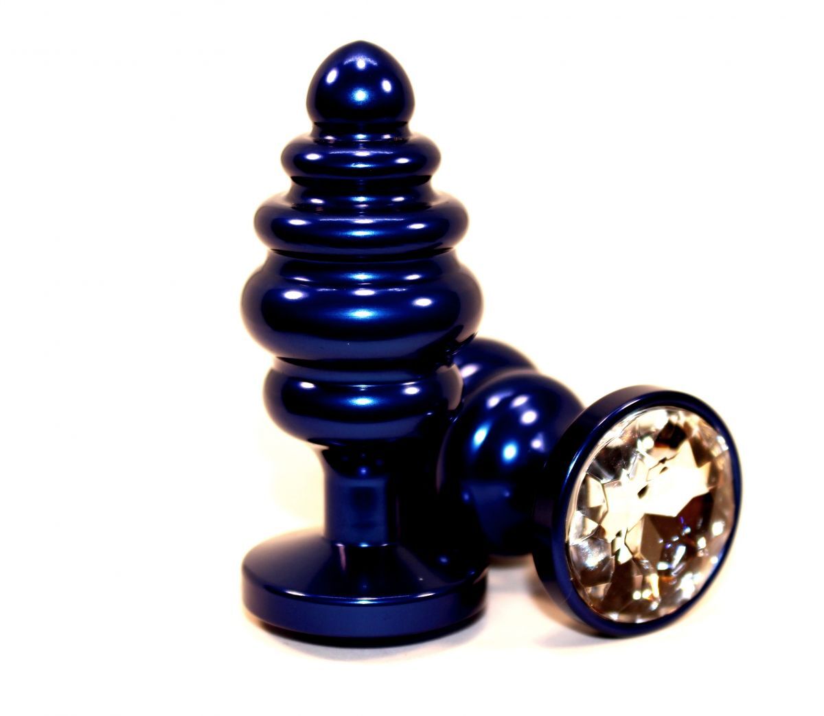 Анальная пробка металлическая, 7.3см, с рифлением и кристаллом, цвет синий/прозрачный