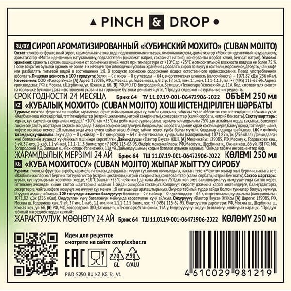 Объем упаковки составляет 250 мл, что позволяет вам наслаждаться сиропом долгое время. Упаковка выполнена в стильном дизайне, а цвет сиропа — светлый, что подчеркивает его свежесть. Сироп «Кубинский мохито» станет отличным дополнением к вашему бару и поможет создать атмосферу праздника в любое время года.