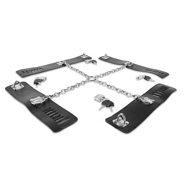 Погрузитесь в мир новых ощущений с системой фиксации для рук и ног, созданной для тех, кто ценит качество и надежность. Каждый элемент набора изготовлен из экокожи премиального качества и дополнен прочными металлическими замками.