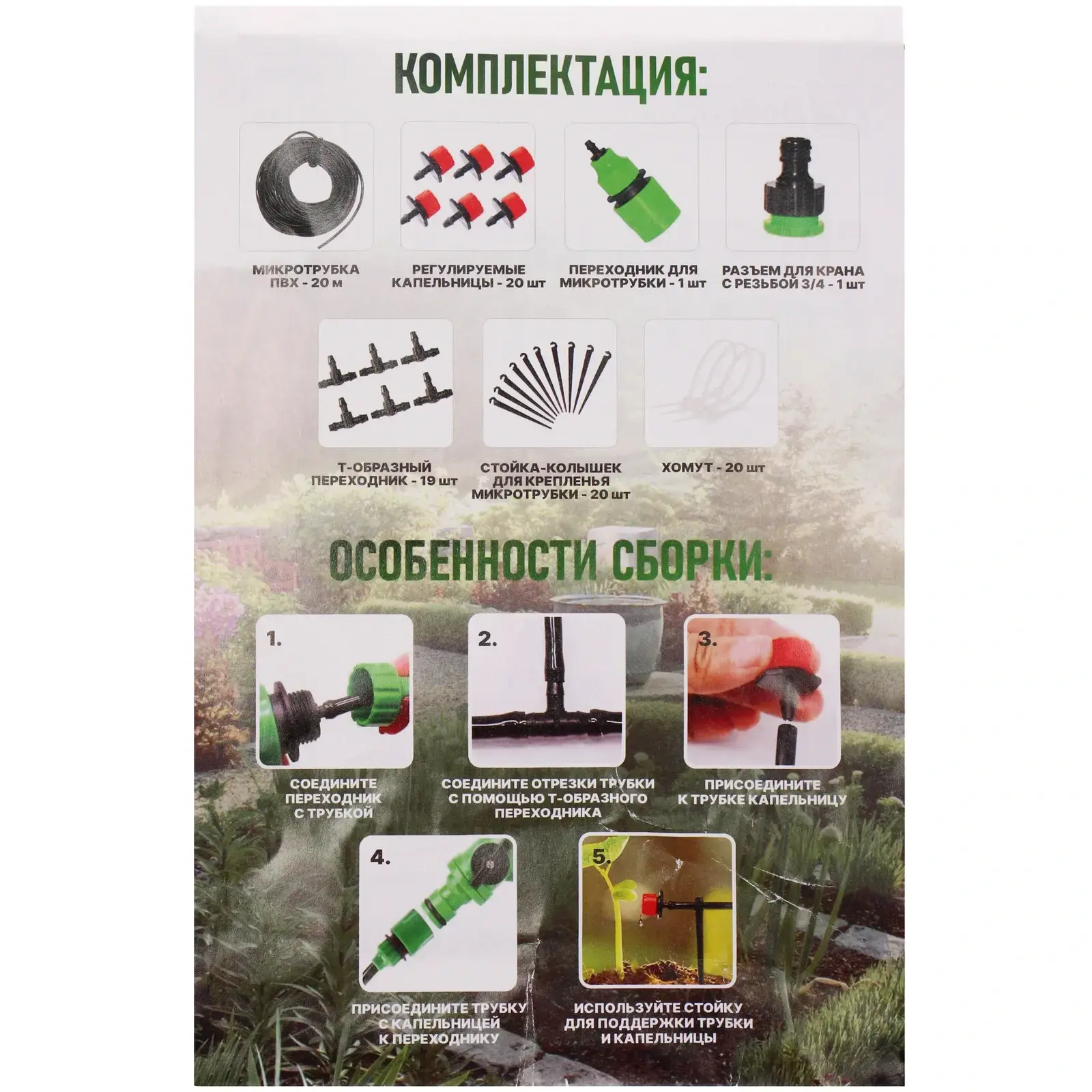20 метров ПВХ трубки, 20 регулируемых капельниц, переходники, T-образные соединители, крепления и хомуты – все необходимое для эффективной работы.