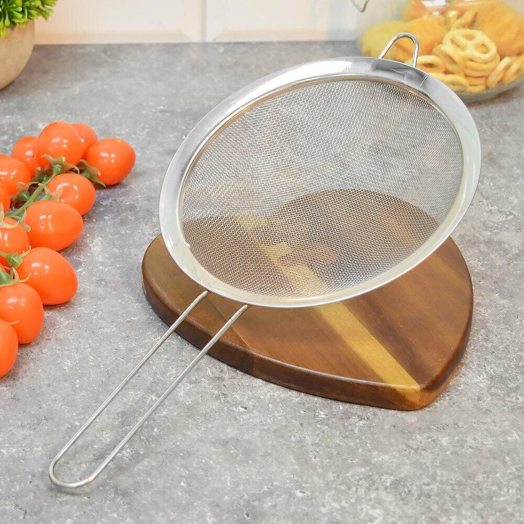Металлическая ручка обеспечивает надежный хват и комфорт при использовании. Мелкая сетка эффективно задерживает даже мельчайшие частицы, а диаметр 180мм позволяет работать с большими объемами продуктов.
