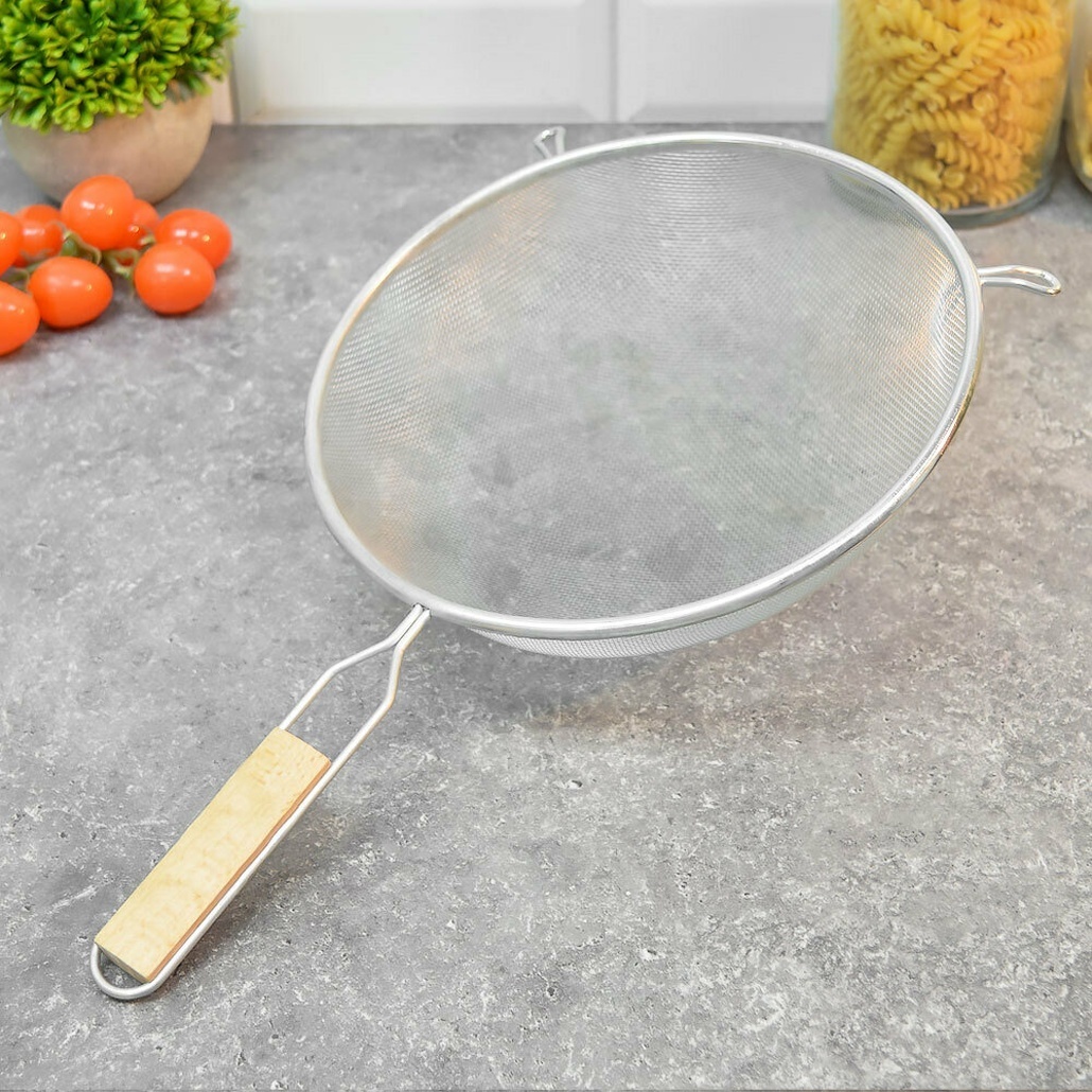 Деревянная ручка обеспечивает комфортный хват и не нагревается во время использования. Металлическая сетка плотного плетения эффективно задерживает даже мелкие частицы, а диаметр 220 мм подходит для большинства кастрюль и мисок.