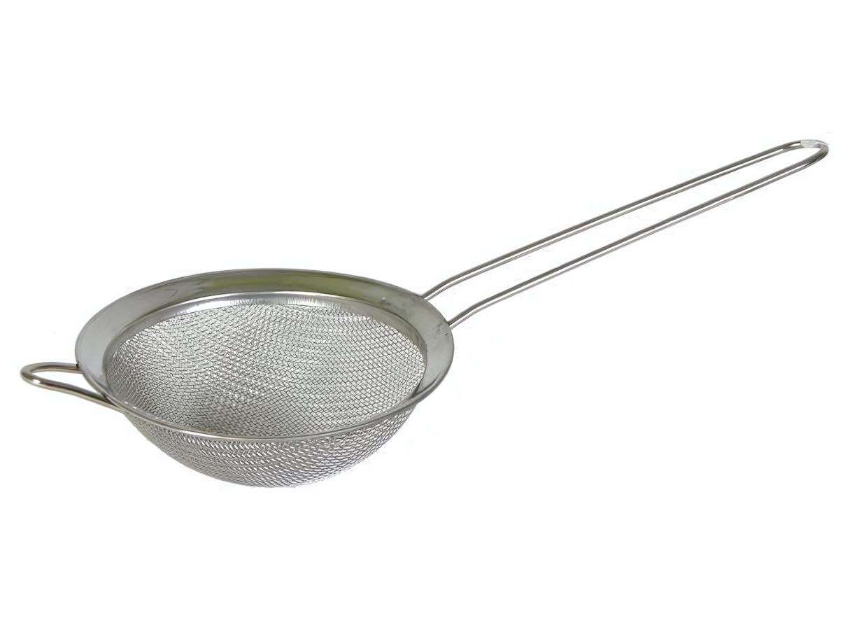 Сито имеет округлую форму и мелкую сетку, что позволяет эффективно отделять твердые частицы от жидкостей. Благодаря двум ручкам, его удобно держать и использовать, что делает процесс отцеживания более комфортным. Это сито идеально подходит как для домашнего использования, так и для профессиональных кухонь.