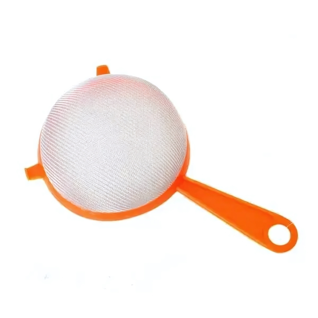 Серебристая металлическая сетка устойчива к деформации и коррозии, а яркая ручка из пищевого пластина делает использование максимально комфортным. Универсальный размер подходит для профессионального и домашнего применения.