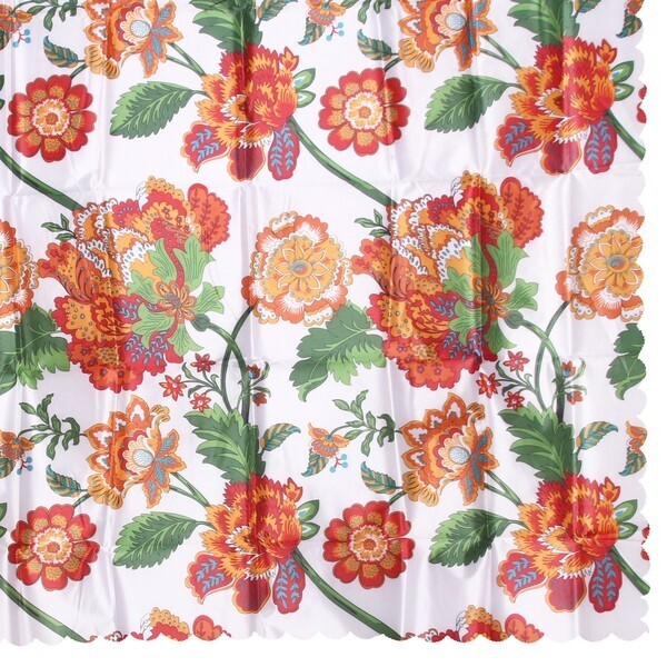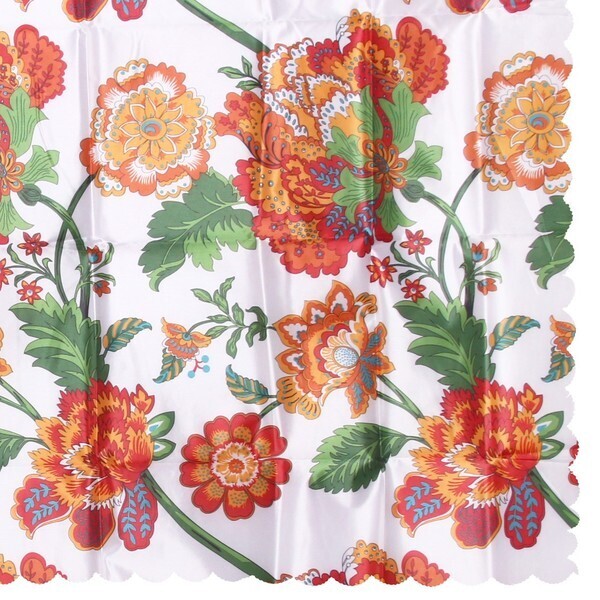 Скатерть имеет прямоугольную форму с волнистым краем по нижнему краю, что добавляет ей изящества. Яркие цветы оранжевого и красного цветов на белом фоне создают эффектный контраст, который привлекает внимание и радует глаз. Эта скатерть станет не только функциональным, но и декоративным элементом вашего дома.