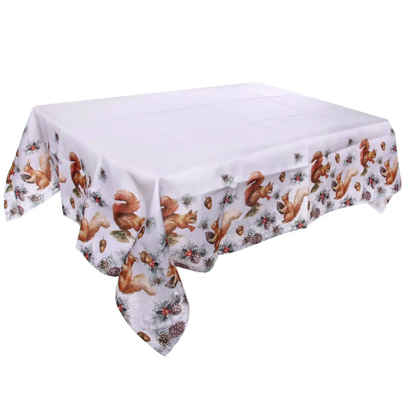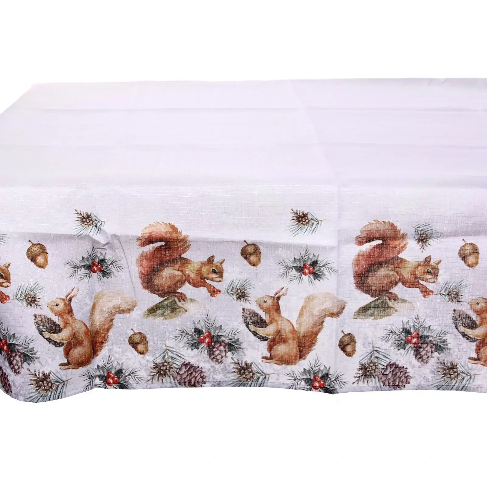 Преимущества: материал из 100% полиэстера обеспечивает долговечность и устойчивость к загрязнениям, а классический белый фон и декоративная кайма с изображениями белок и шишек создают праздничное настроение и гармонично сочетаются с любым интерьером.