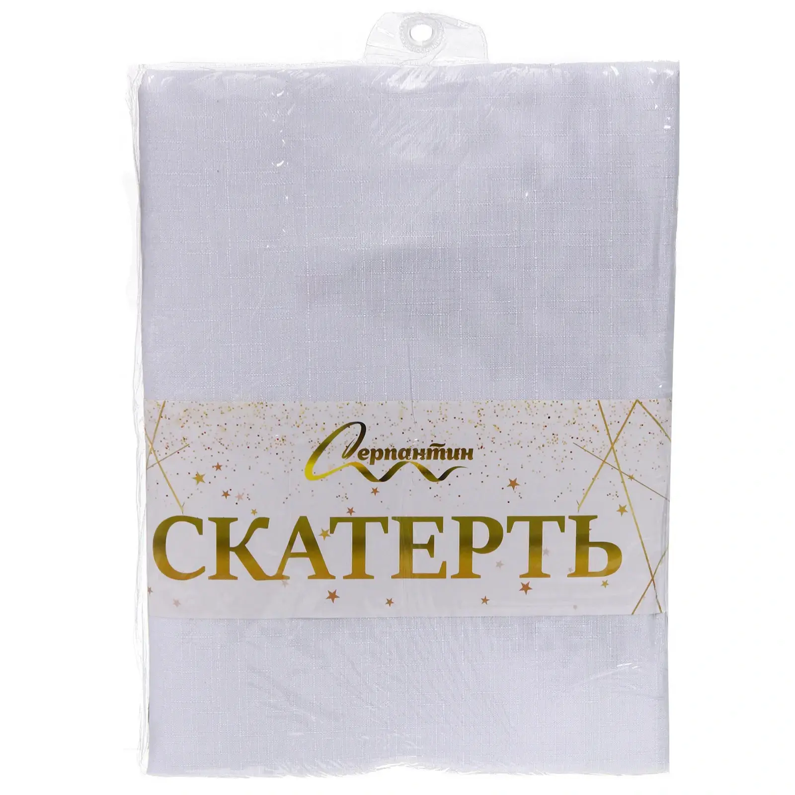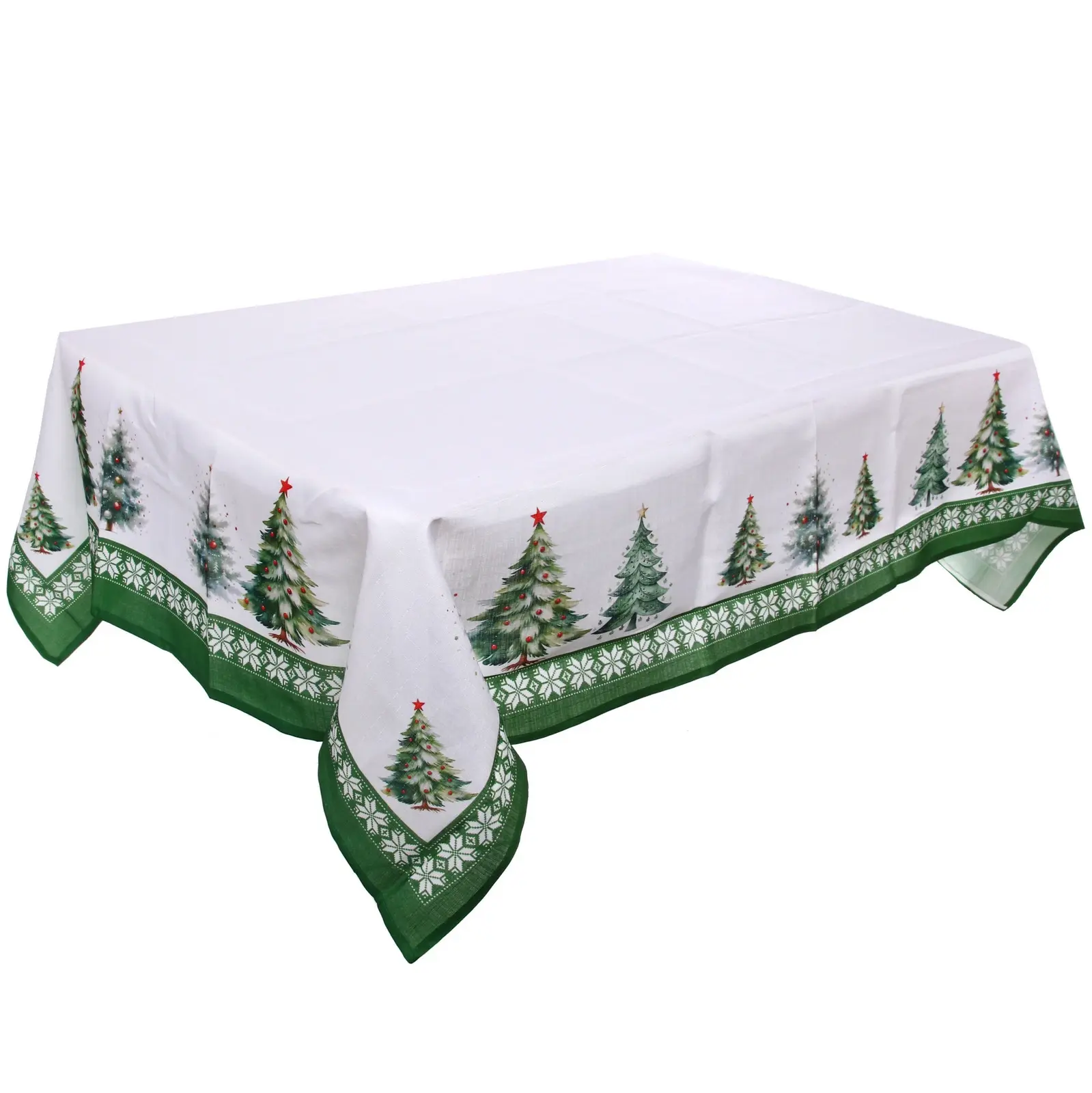 Размер скатерти – 140×176 см, форма прямоугольная. Материал – 100% полиэстер с текстурой ткани, приятный на ощупь и устойчивый к появлению пятен. Цвета – белый фон, зелёный бордюр, яркие акценты в красном, золотом и серебристом. Идеально подходит для стандартных обеденных и праздничных столов.
