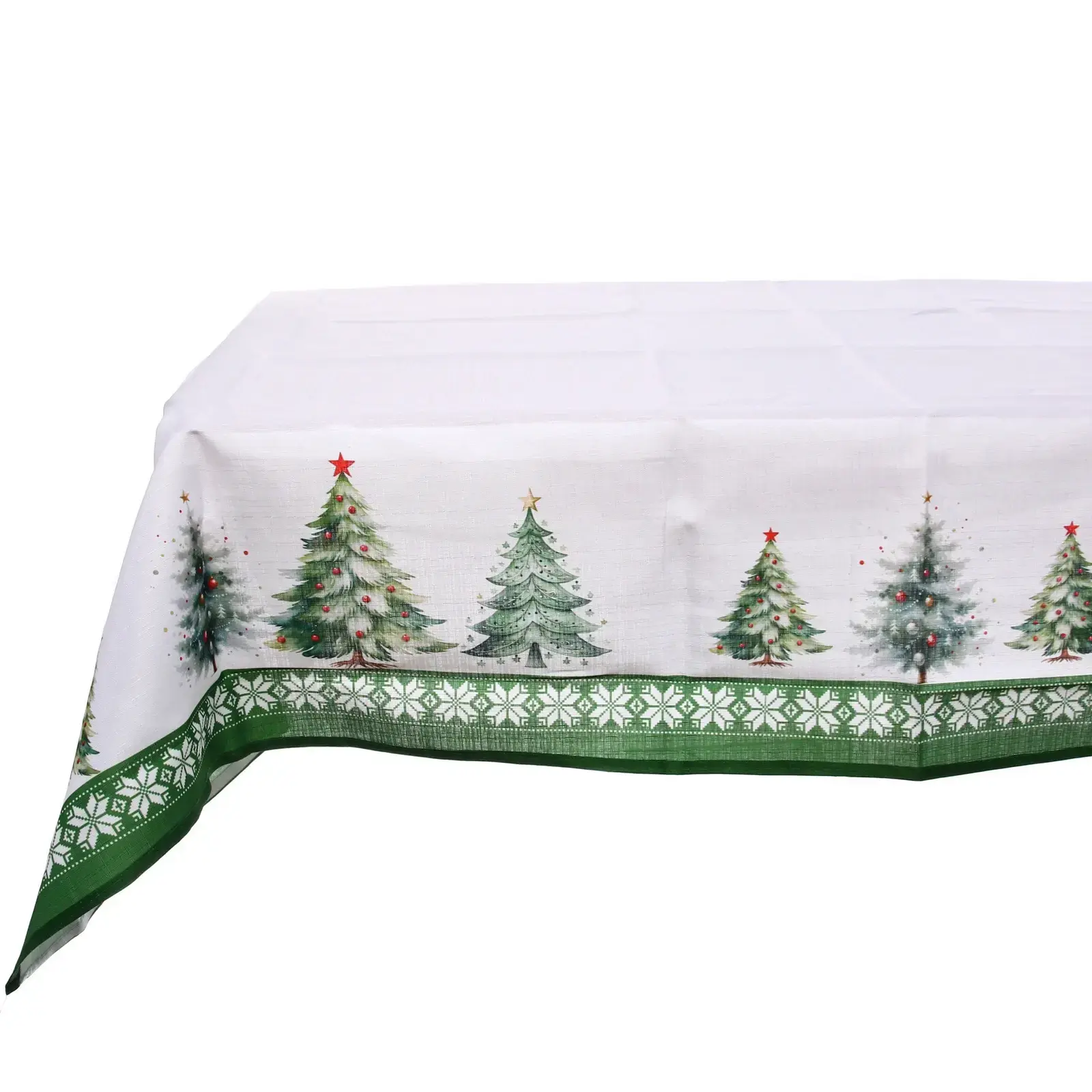 Создайте атмосферу настоящего праздника всего за пару секунд, просто застелив стол этой нарядной скатертью. Белоснежное полотно с зелёным бордюром и ярким орнаментом из новогодних ёлок мгновенно погружает в зимнюю сказку и придаёт теплоту любой встрече с близкими. Она отлично подходит для сервировки в новогоднюю ночь, рождественский ужин или зимнее семейное чаепитие.