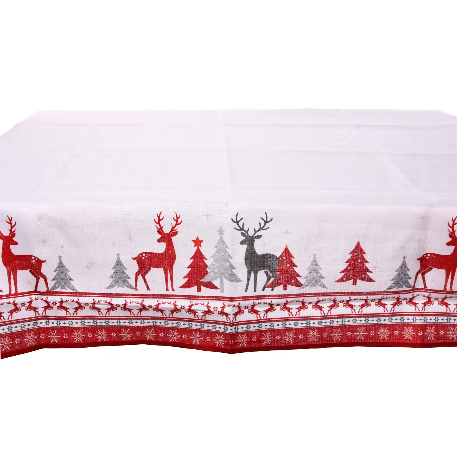 Белая основа скатерти украшена вниманием к деталям: по краям — красные и серые олени, стилизованные елки и снежинки, дополненные декоративными элементами. Края аккуратно завернуты для эстетичного вида. Скатерть станет гармоничным украшением вашего новогоднего стола, подчеркивая атмосферу праздника.