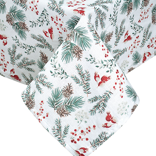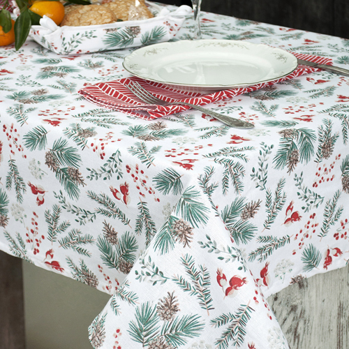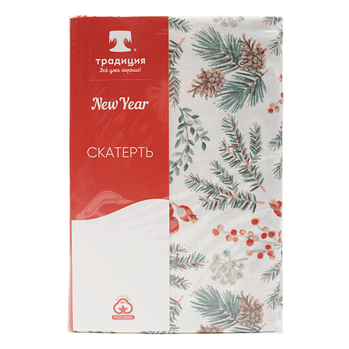 Скатерть размером 145х180 см подходит для обеденных столов различной формы. Она легко стирается и быстро сохнет, что экономит ваше время на уборку после праздников. Благодаря современному дизайну с изображениями елочных ветвей, шишек и ягод, скатерть станет ярким акцентом на вашем столе, создавая уютную атмосферу для семейных встреч и праздников.