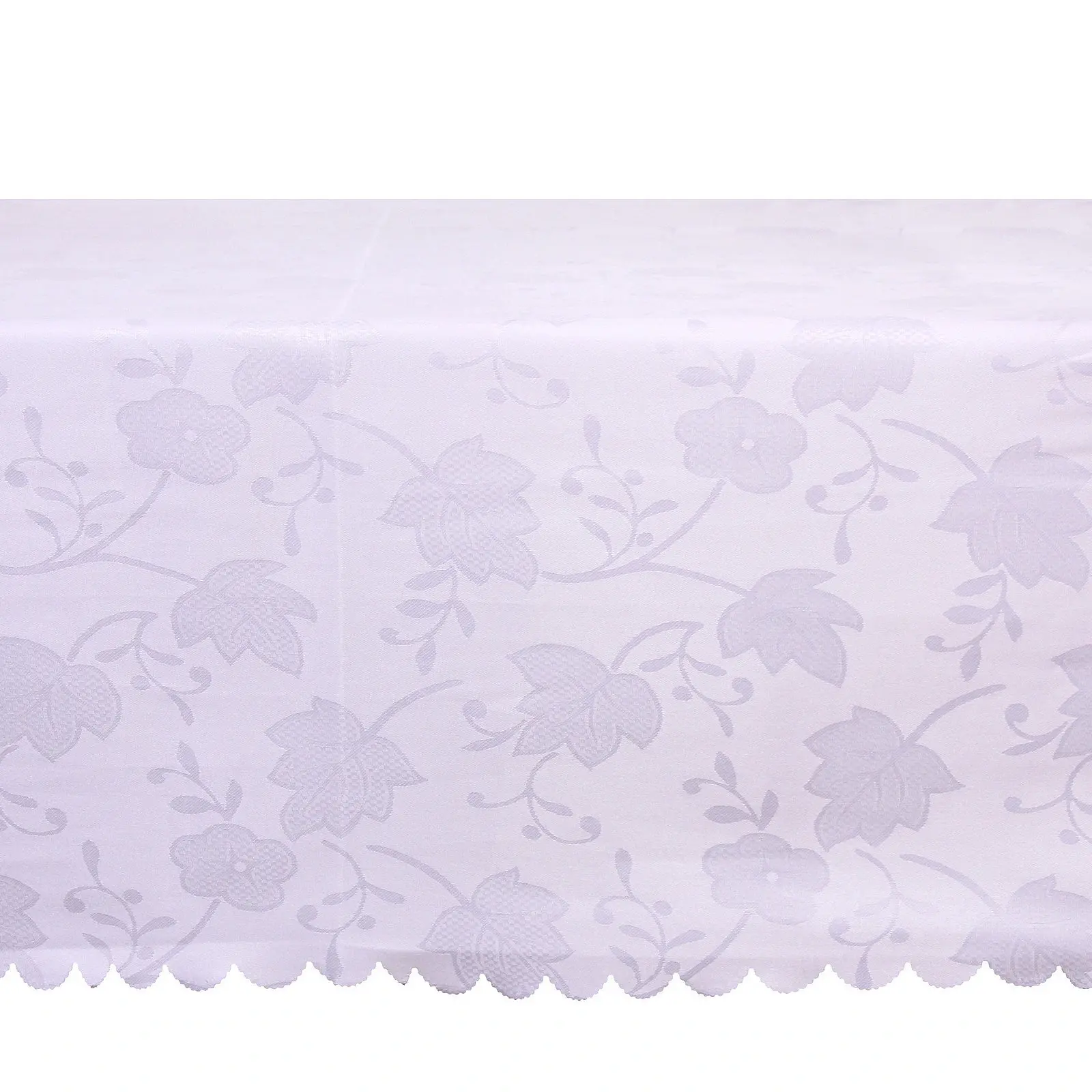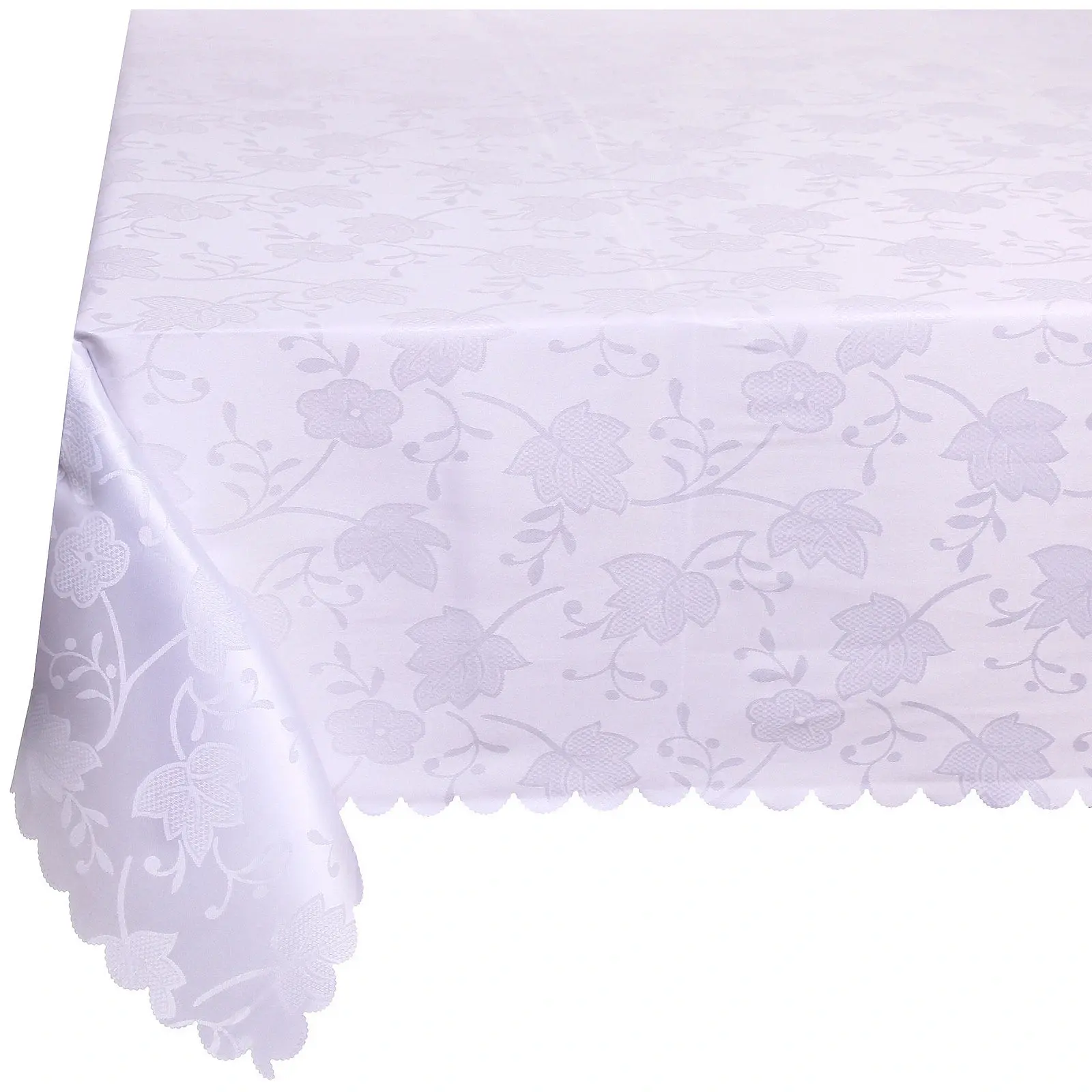 Материал: 100% полиэстер — легко стирается, быстро сохнет, не требует сложного ухода. Поверхность скатерти устойчива к образованию складок, что позволяет сохранять аккуратный вид даже после многократного использования. Края выполнены с фигурным волнистым вырезом, который красиво драпируется по столу.
