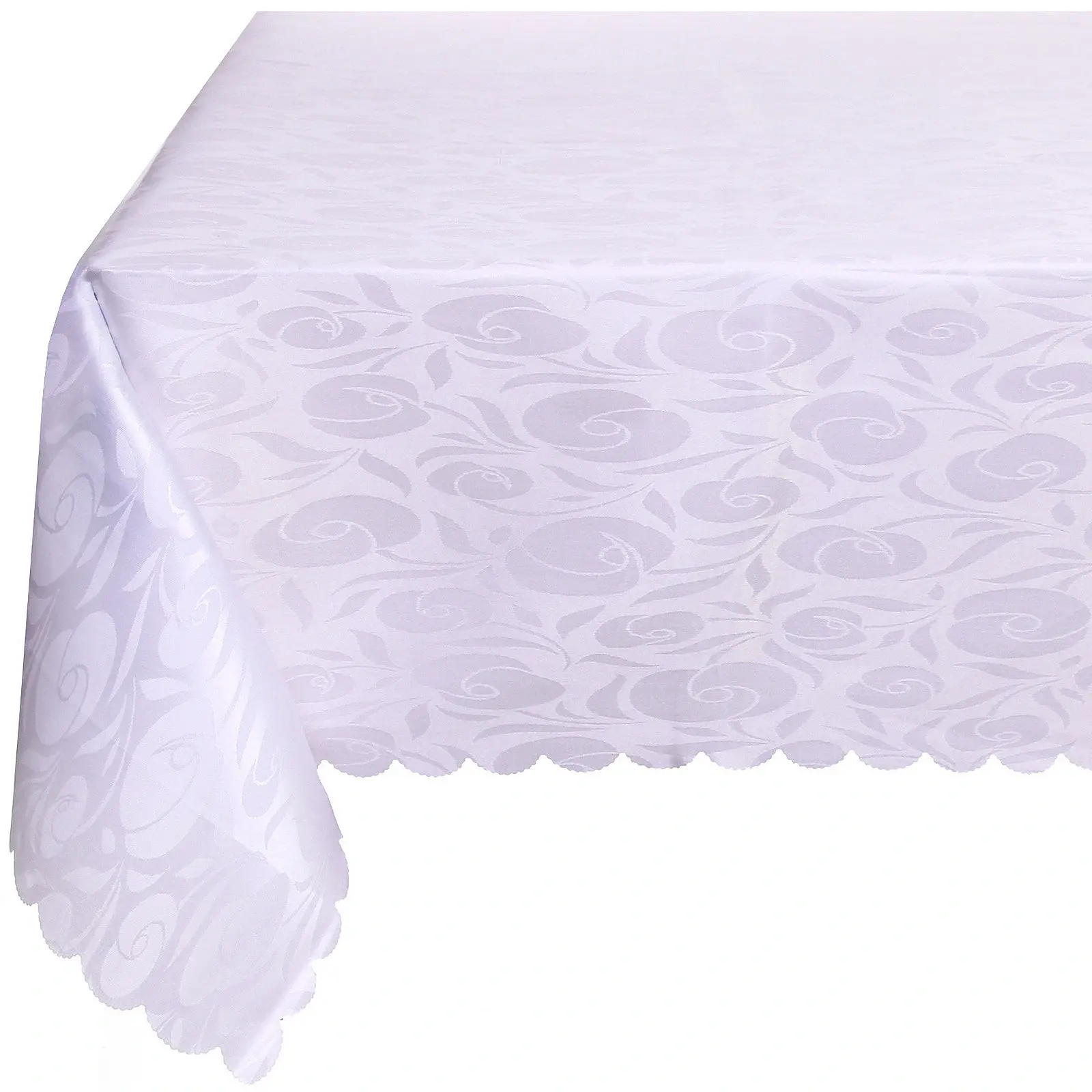Размер скатерти — 148x180 см, что позволяет использовать её для стандартных обеденных столов в кухне или гостиной. Полиэстеровая ткань устойчива к пятнам, проста в уходе — достаточно машинной или ручной стирки с мягким моющим средством. Белый цвет и жаккардовая текстура придадут вашему столу аккуратный и торжественный вид, а прочная структура ткани обеспечит долгий срок службы.