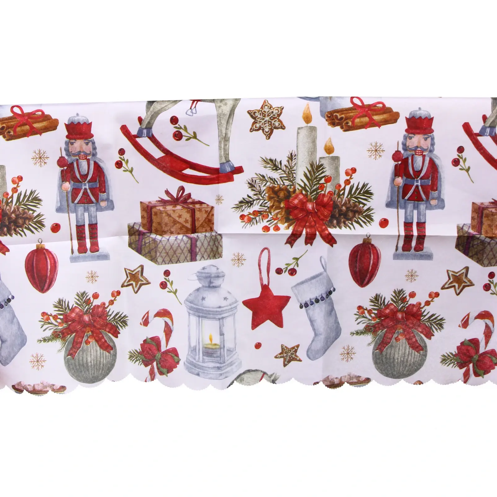 Погрузитесь в атмосферу новогоднего уюта: яркая печать с элементами щелкунчика, свечей и ёлочных украшений делает любой стол волшебным центром внимания.