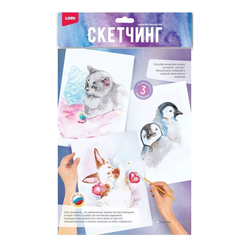 Специальная плотная бумага предотвращает деформацию при нанесении красок, а готовые контуры животных избавляют от необходимости делать эскиз. Техника акварельного скетчинга развивает чувство цвета и композиции, подходит для творчества с детьми от 8 лет.