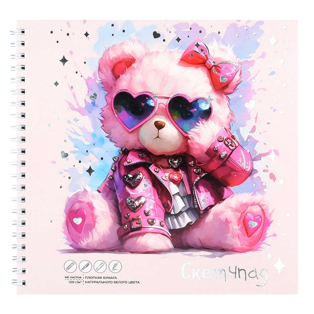 Обложка выполнена с применением полноцветной печати и украшена очаровательным принтом с розовым мишкой в стильных очках. Декоративные элементы — звезды, сердца и детали одежды персонажа — выделены эффектным тиснением серебристой фольгой, что придает изделию нарядный и запоминающийся вид. Крепление на металлическом гребне (пружине) по короткой стороне позволяет полностью раскрывать скетчпад на 360 градусов, обеспечивая максимальный комфорт при рисовании даже на весу.