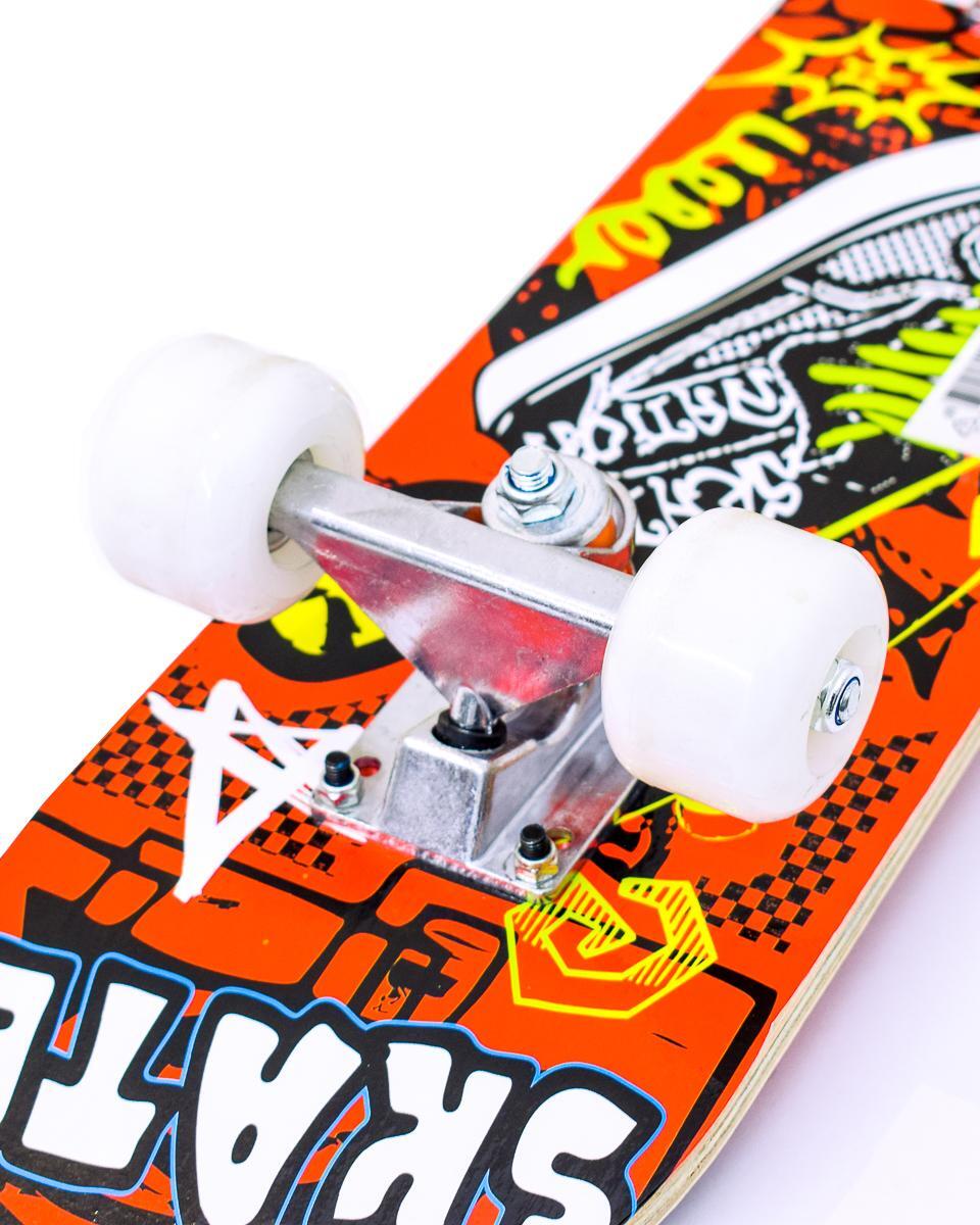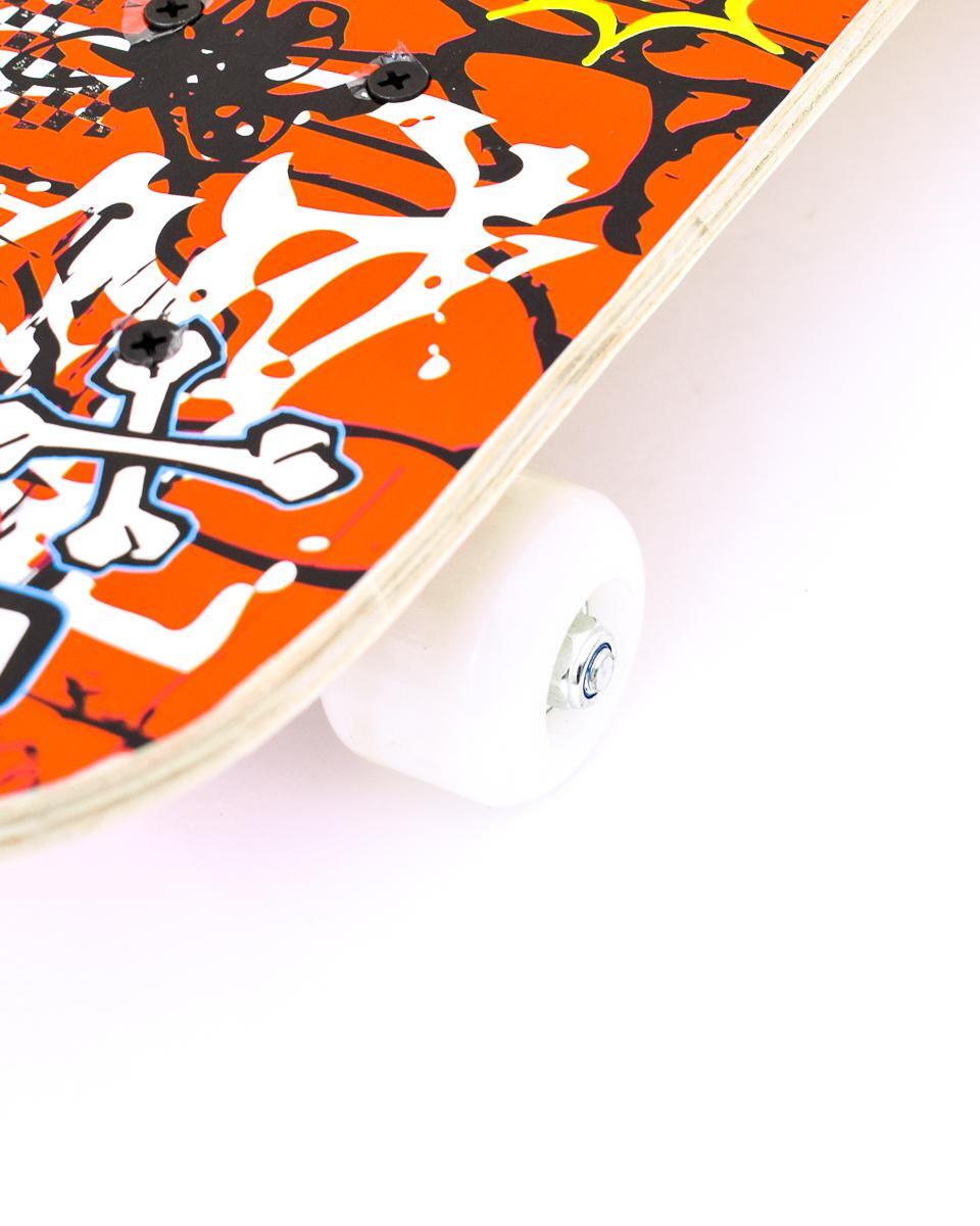 Скейтборд изготовлен из качественных материалов: основа выполнена из многослойной древесины, обеспечивающей необходимую гибкость и прочность. Колеса из полиуретана гарантируют плавное движение и хорошее сцепление с поверхностью.