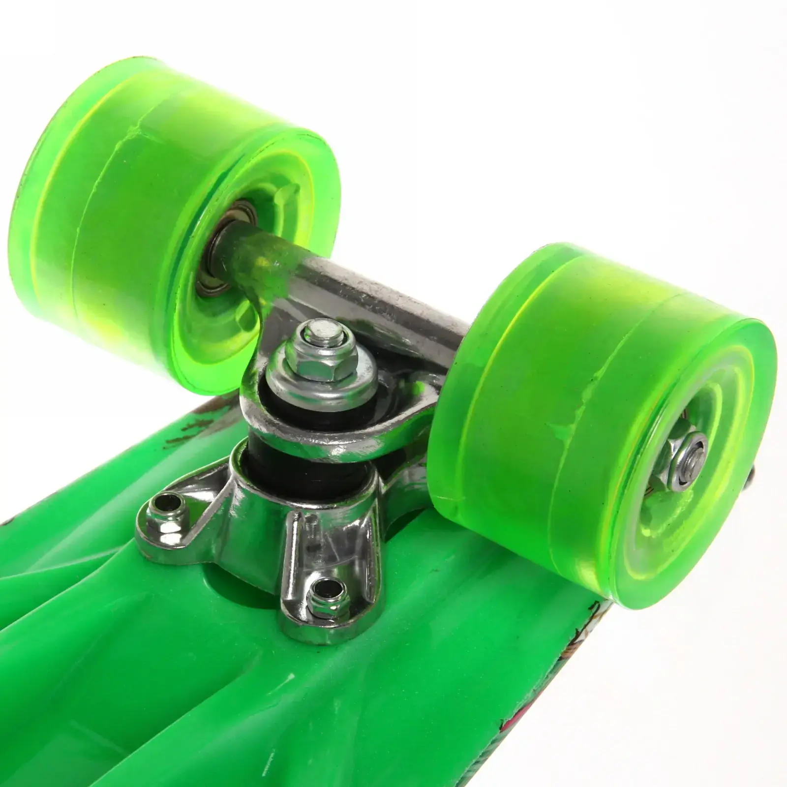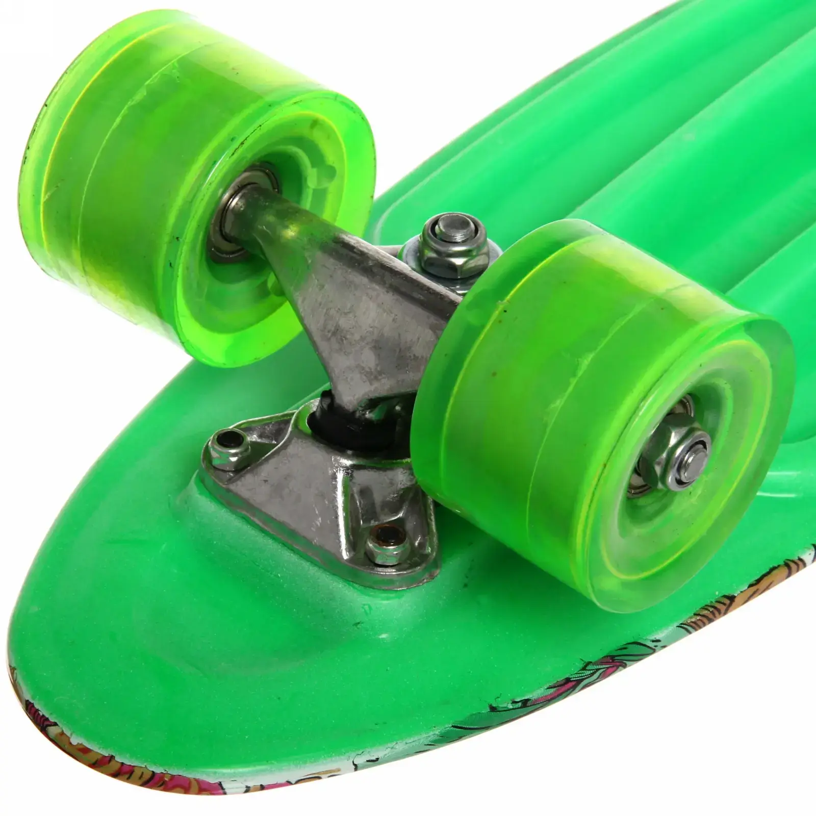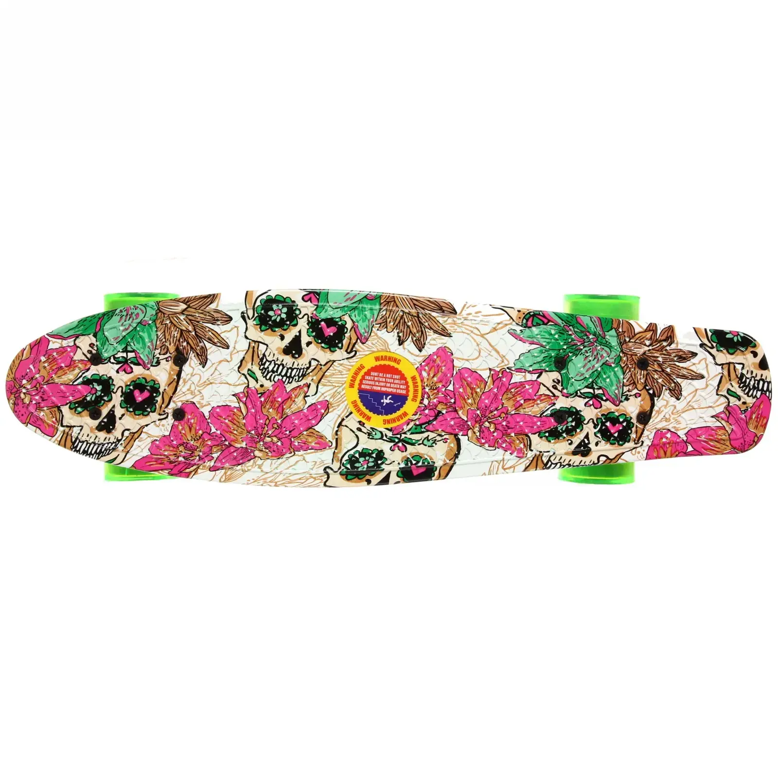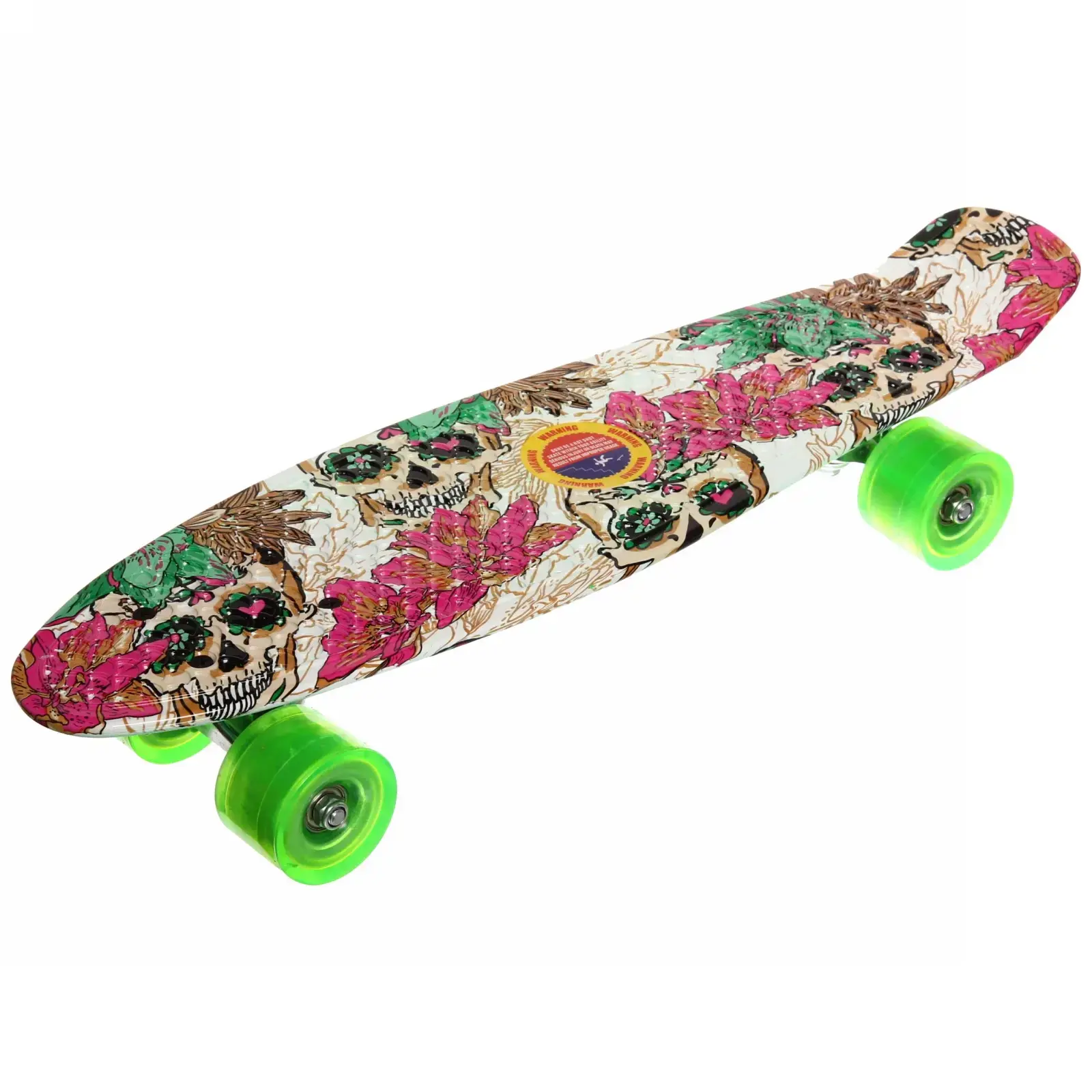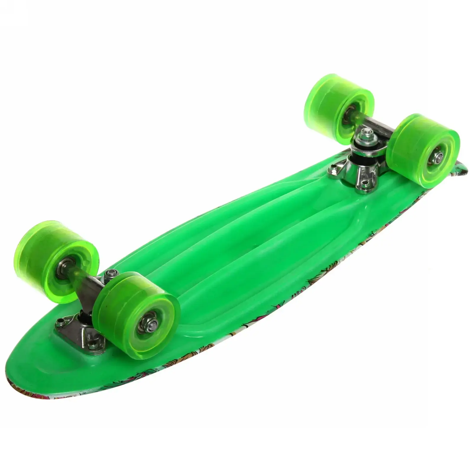 Покоряйте городские улицы с лёгкостью! Скейтборд с уникальным дизайном в цветочных мотивах и черепами сочетает эстетику и функциональность. Рифлёная поверхность деки обеспечивает надёжное сцепление, а полупрозрачные зелёные колёса из ПВХ диаметром 60 мм гарантируют плавный ход даже на неровном асфальте.