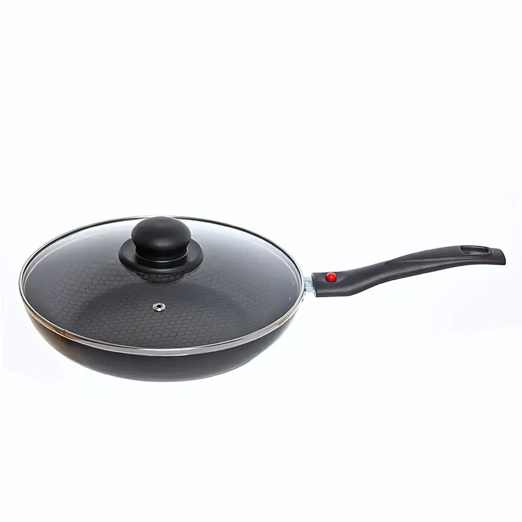 Сковорода имеет диаметр 24 см и выполнена из качественного алюминия, что обеспечивает равномерное распределение тепла. Черный цвет сковороды с металлическим ободком придаёт ей стильный вид, а текстурированная поверхность с шестиугольным узором добавляет оригинальности. Крышка из стекла позволяет следить за процессом приготовления без необходимости открывать её.