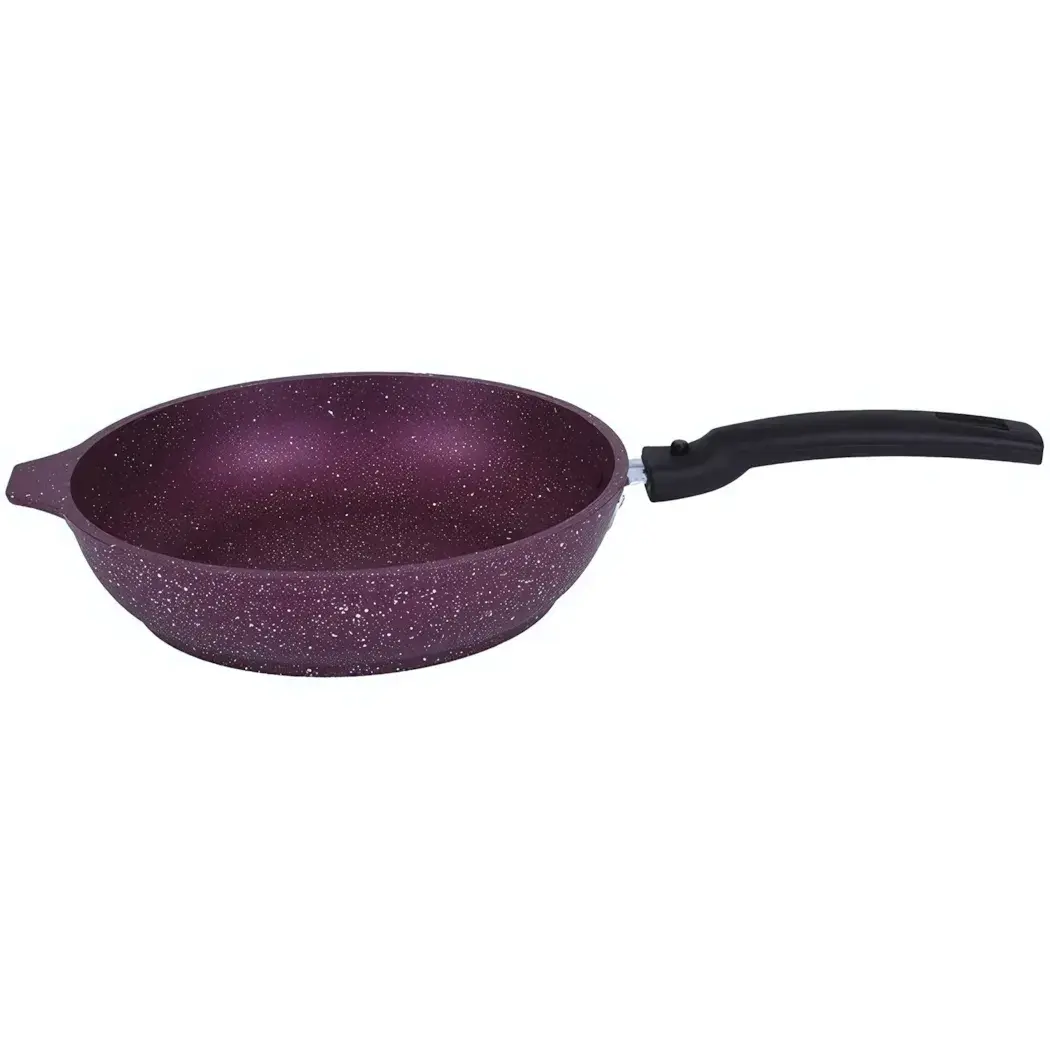 Сковорода имеет диаметр 24 см и выполнена в стильном фиолетовом цвете с белыми вкраплениями, что делает её не только функциональной, но и привлекательной. Она подходит для всех типов плит, что делает её универсальным решением для любой кухни.