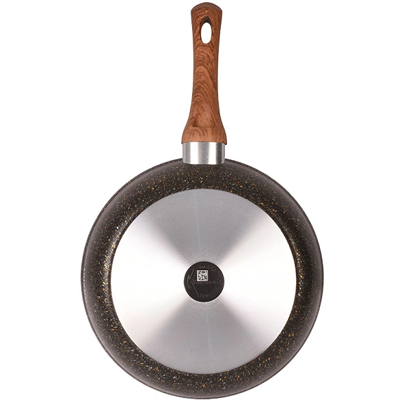 Сковорода идеально подходит как для жарки, так и для тушения. Она выполнена из литого алюминия, что обеспечивает отличные теплораспределительные свойства. Ручка, выполненная из материала, имитирующего дерево, не нагревается, что делает использование сковороды безопасным и комфортным. Подходит для всех типов плит, включая индукционные.